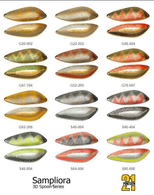 Серия колеблющихся блесен Pontoon21 3D spoon состоит из трех моделей- Sampliora, Sintura, Sabletta, различных по пропорциям длины к ширине, имеют по несколько длин и по два веса в каждой из них, удовлетворяя потребности практически любого спиннингиста для большинства условий ловли. Все они превосходно работают на разных скоростях равномерной проводки и в спокойной воде, и в бурном потоке, не сбиваясь с ритма и не срываясь в «штопор». При ступенчатой проводке, на паузах 3D spoon демонстрируют изумительную игру при погружении. Они также идеально подходят для ловли в отвес и зимой со льда.