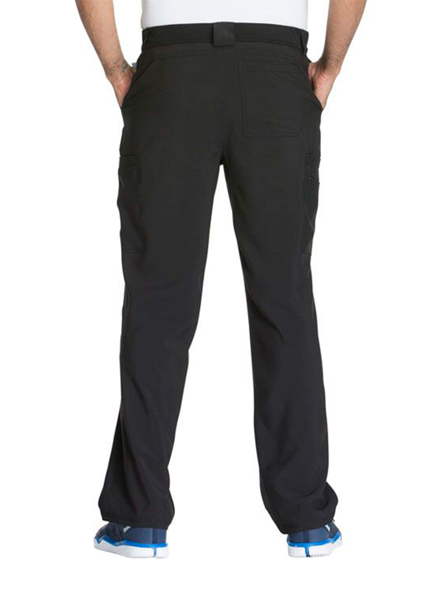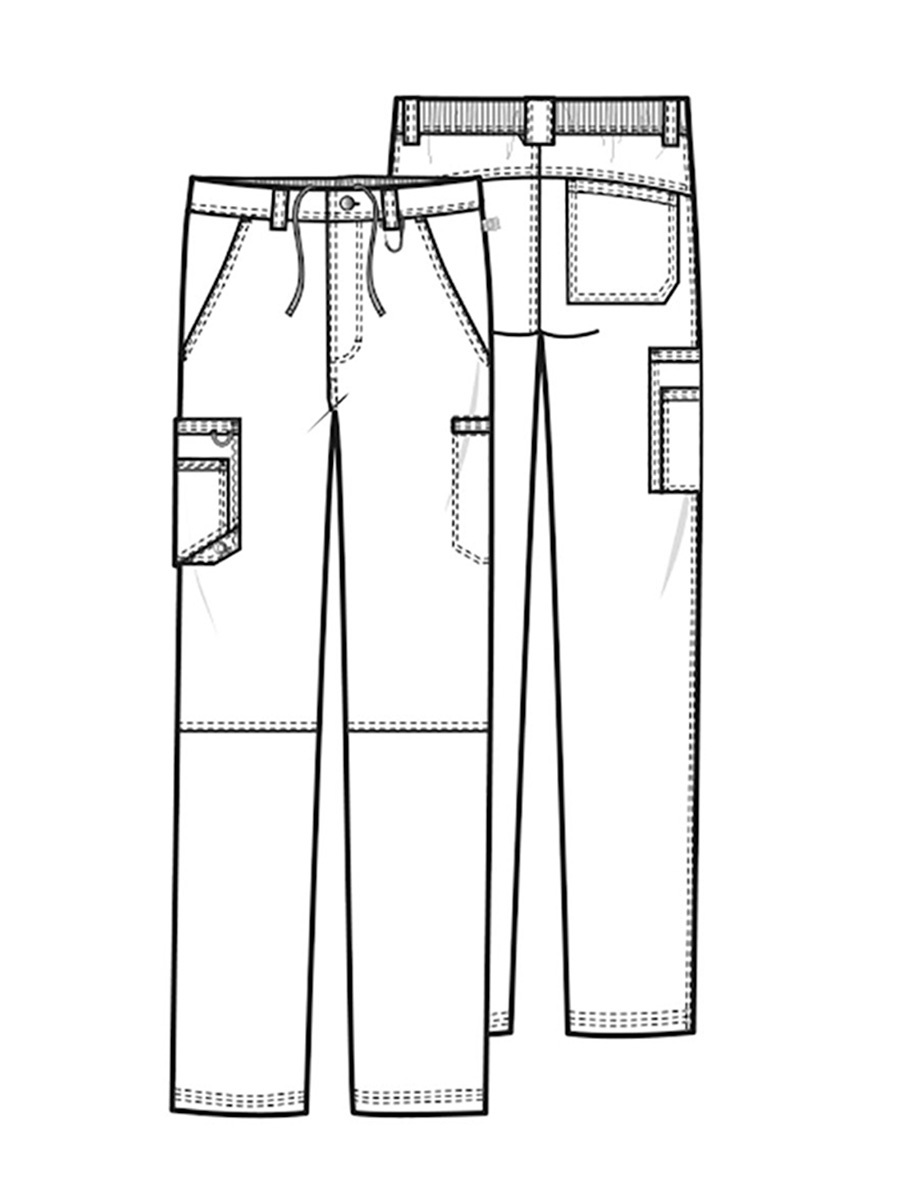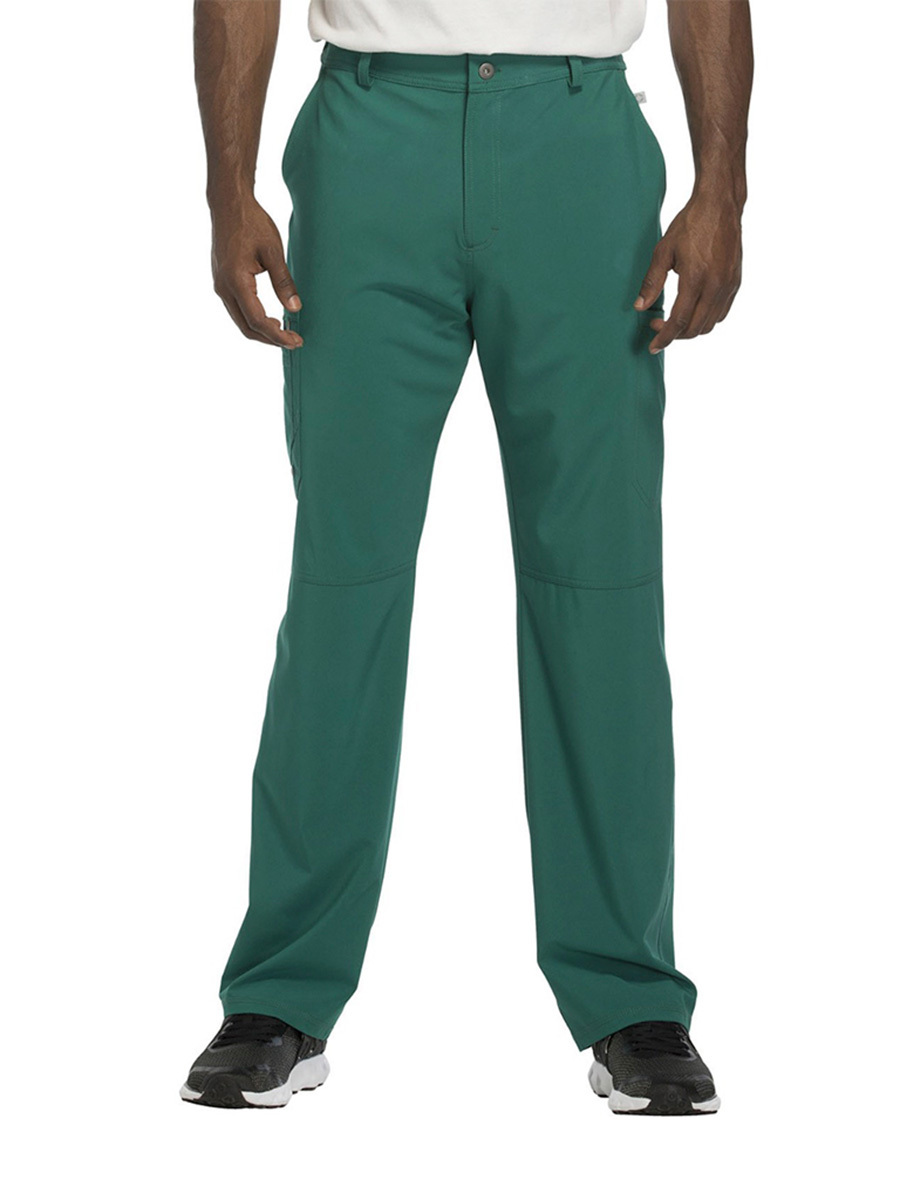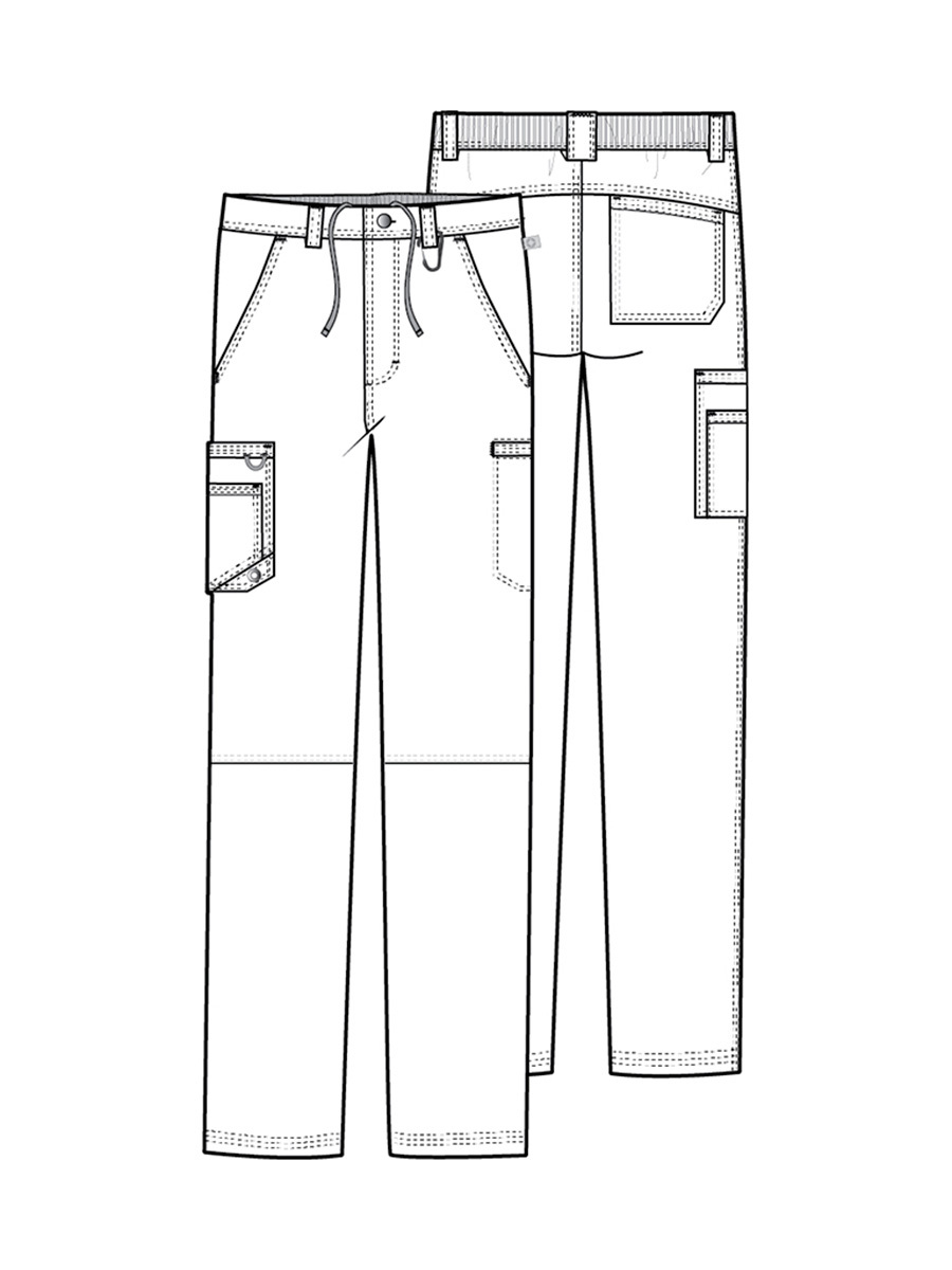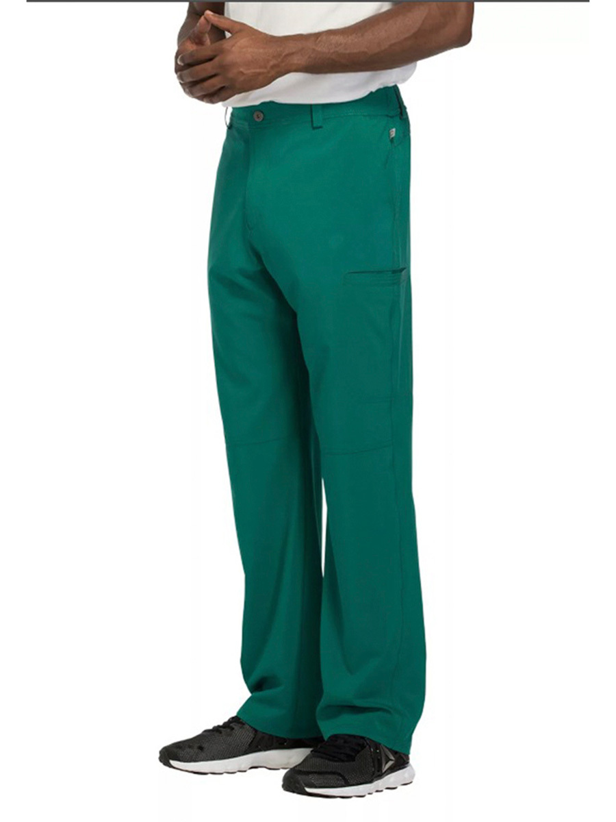 Мужские медицинские брюки Cherokee CK200A с зауженными штанинами имеют внутреннюю функциональную кулиску, эластичный пояс сзади с ребристой вязкой, пять шлевок для ремня, ширинку на молнии с застежкой на пуговицы и потайную ластовицу во внутреннем шве для дополнительного удобства. Изделие дополнено двумя передними угловыми карманами, правым двойным грузовым карманом с петлей для бейджа, левым прорезным грузовым карманом и задним накладным карманом.