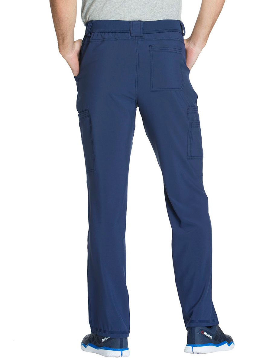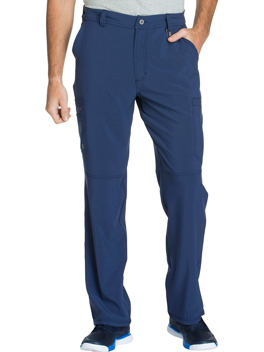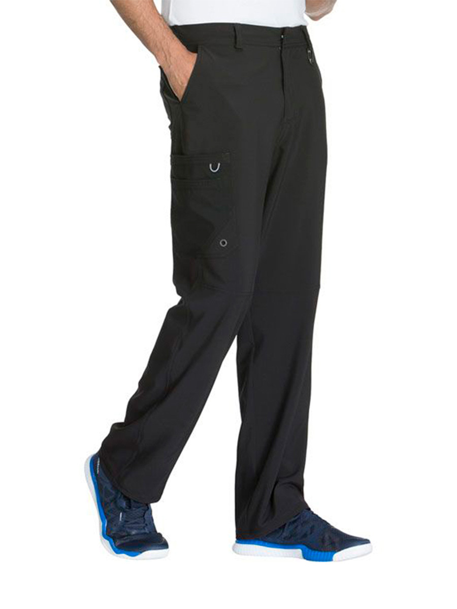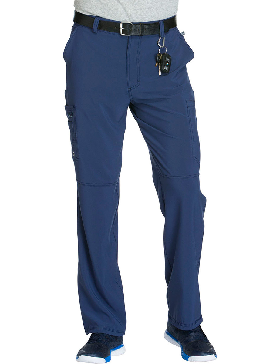 Мужские медицинские брюки Cherokee CK200A с зауженными штанинами имеют внутреннюю функциональную кулиску, эластичный пояс сзади с ребристой вязкой, пять шлевок для ремня, ширинку на молнии с застежкой на пуговицы и потайную ластовицу во внутреннем шве для дополнительного удобства. Изделие дополнено двумя передними угловыми карманами, правым двойным грузовым карманом с петлей для бейджа, левым прорезным грузовым карманом и задним накладным карманом.
