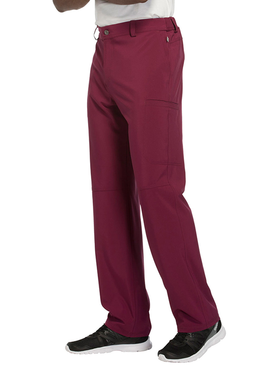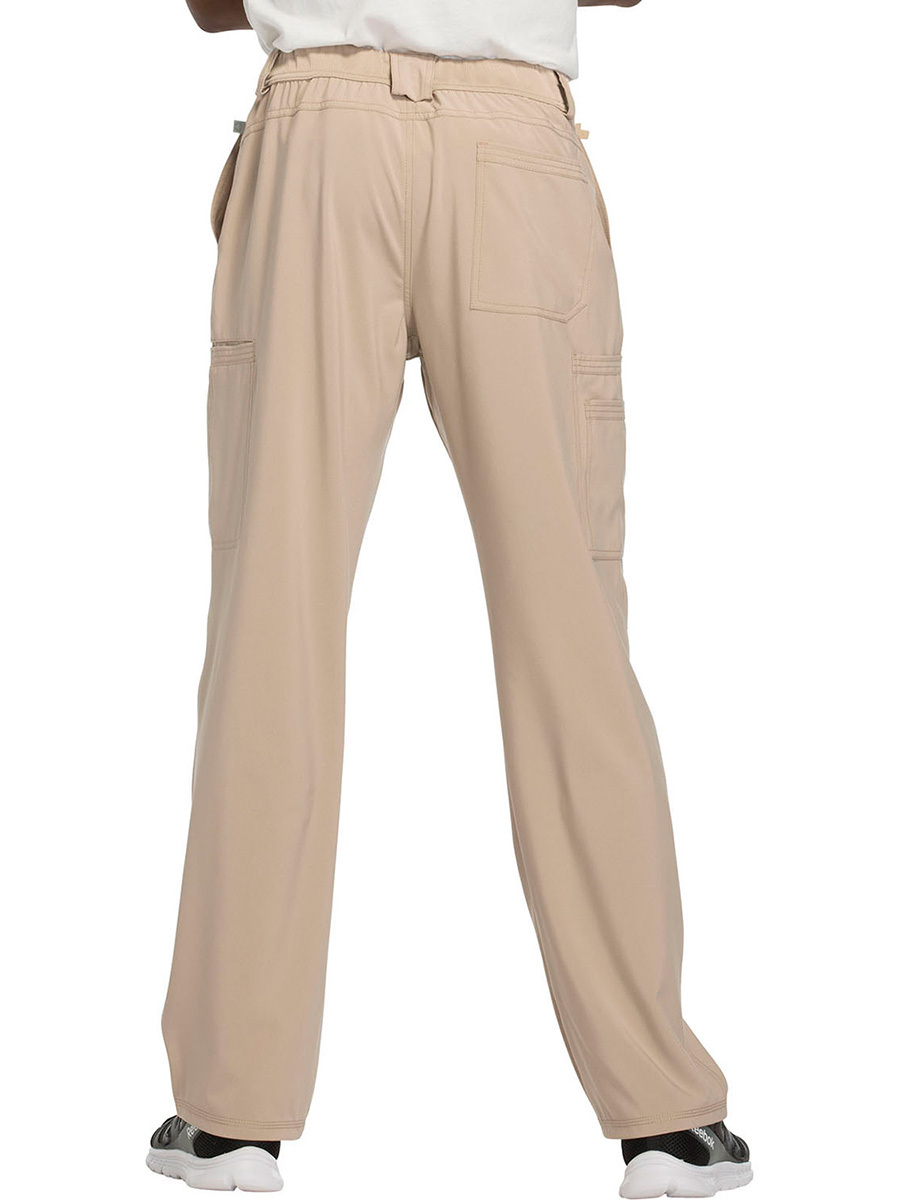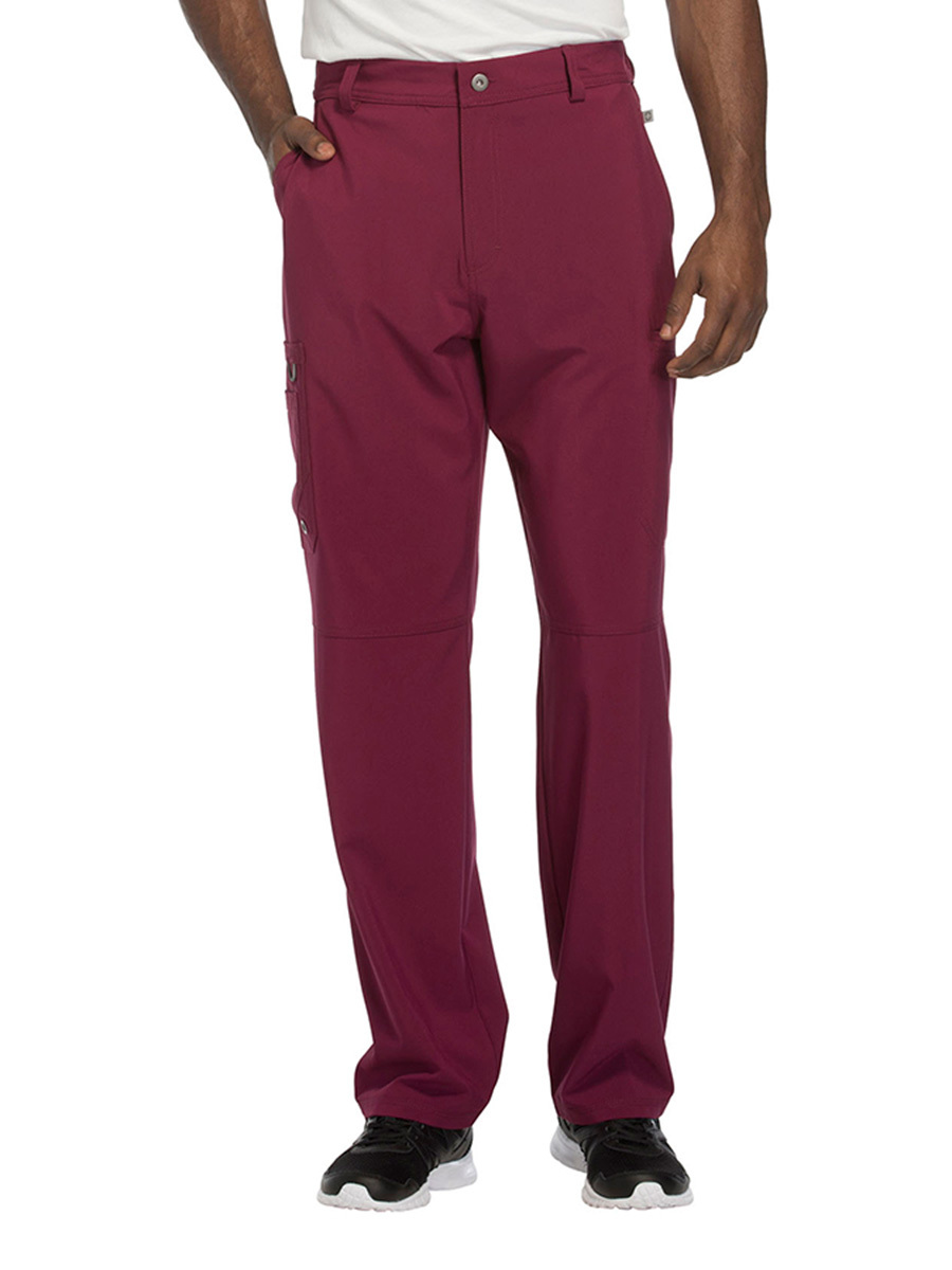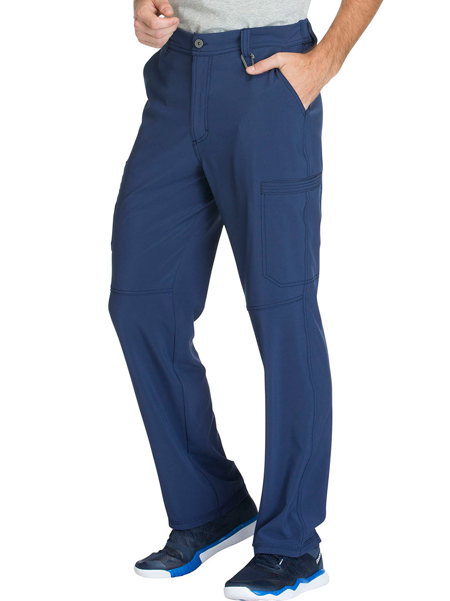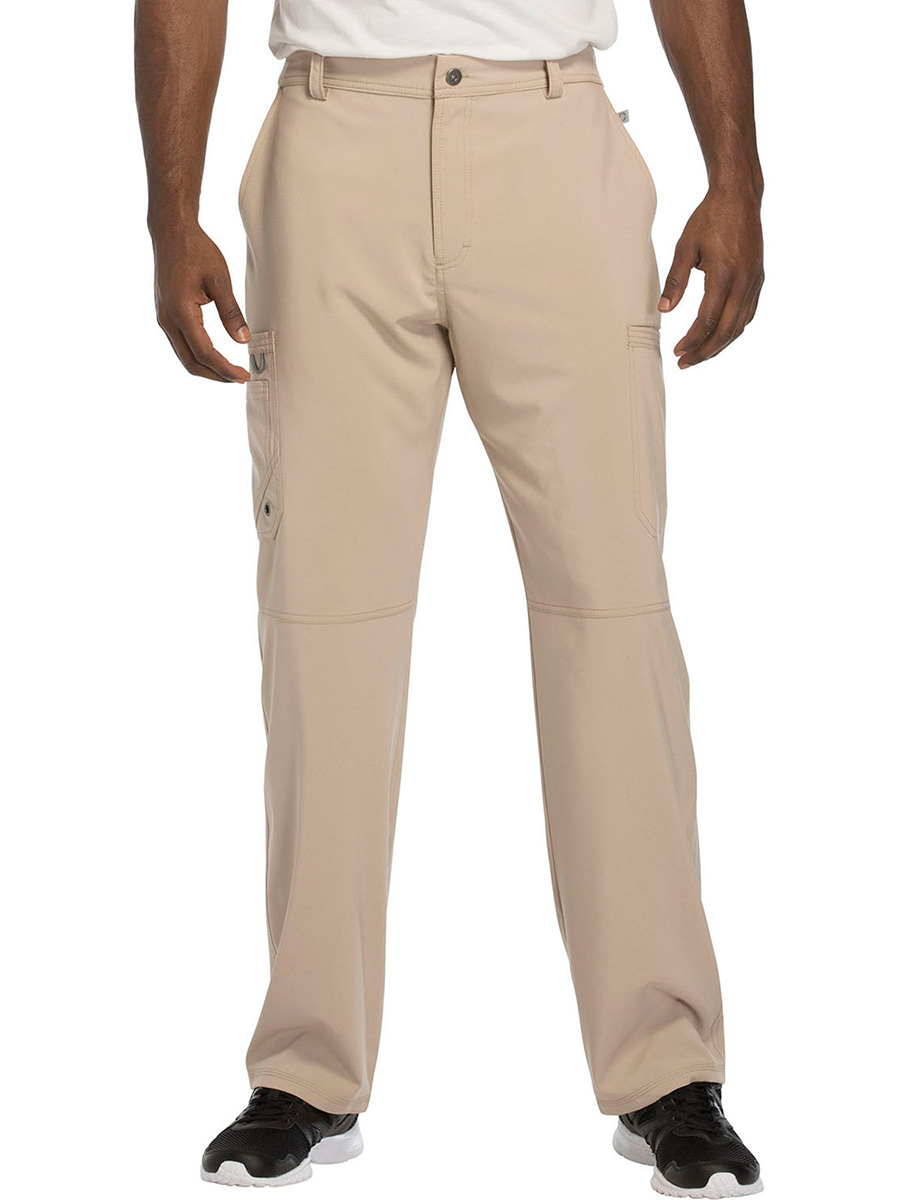 Мужские медицинские брюки Cherokee CK200A с зауженными штанинами имеют внутреннюю функциональную кулиску, эластичный пояс сзади с ребристой вязкой, пять шлевок для ремня, ширинку на молнии с застежкой на пуговицы и потайную ластовицу во внутреннем шве для дополнительного удобства. Изделие дополнено двумя передними угловыми карманами, правым двойным грузовым карманом с петлей для бейджа, левым прорезным грузовым карманом и задним накладным карманом.