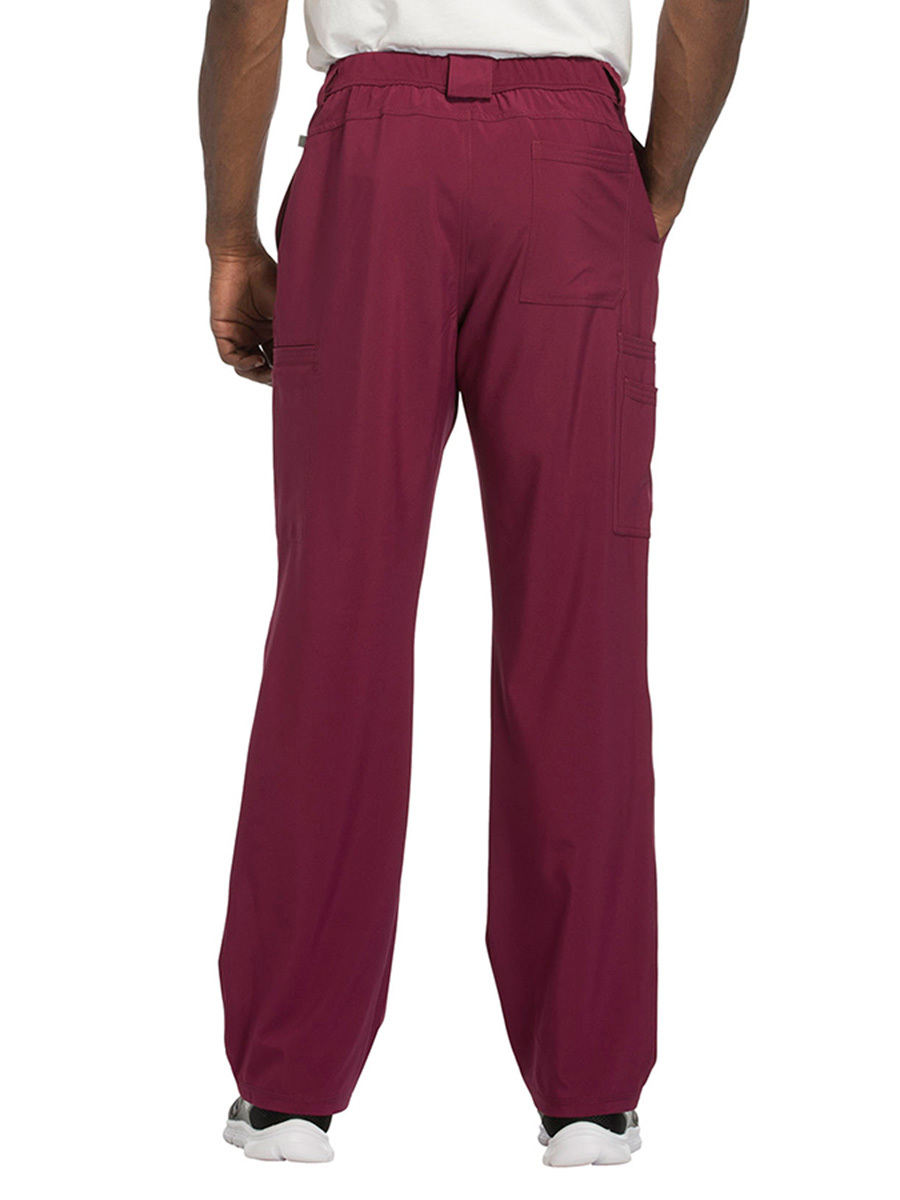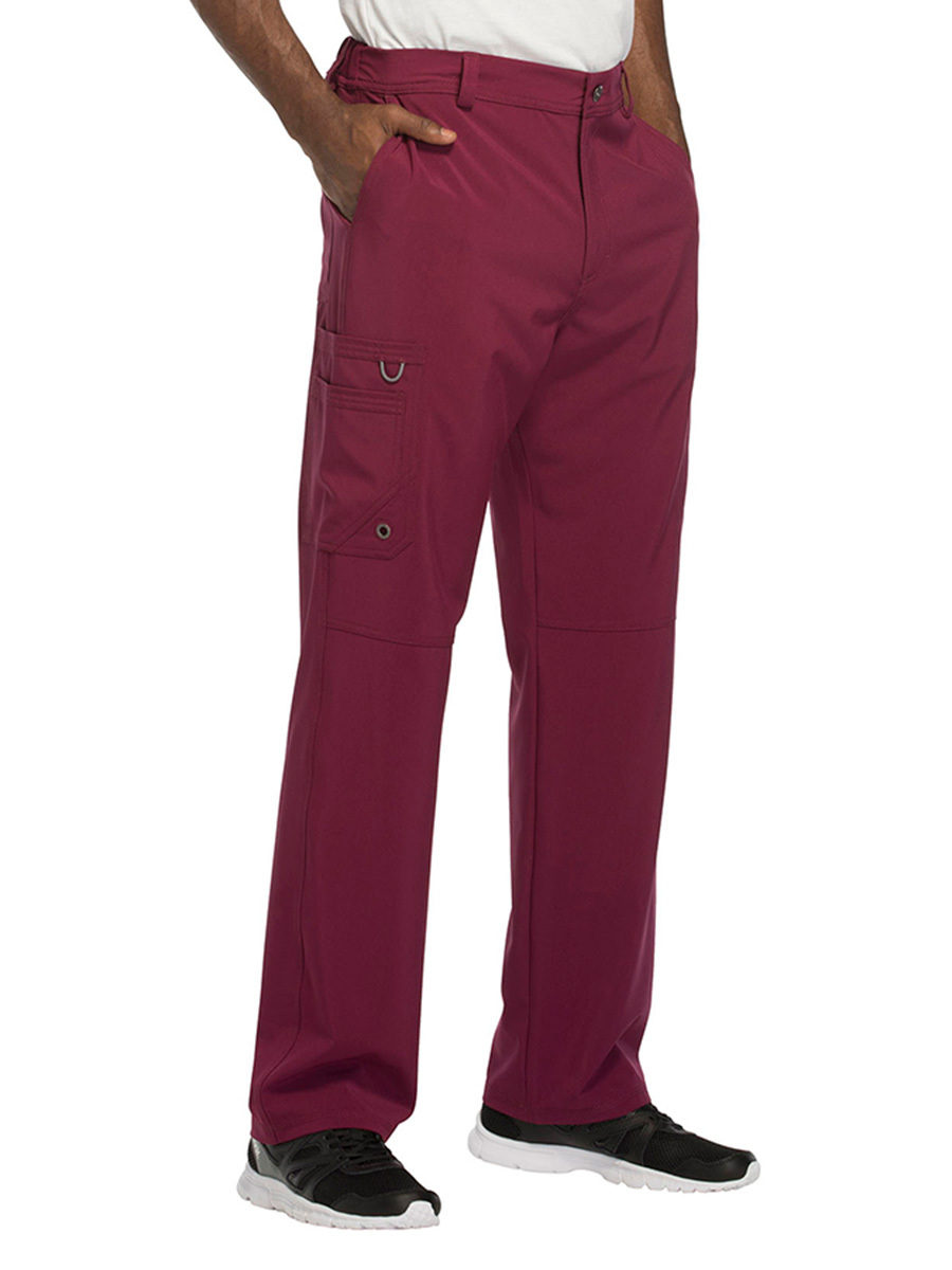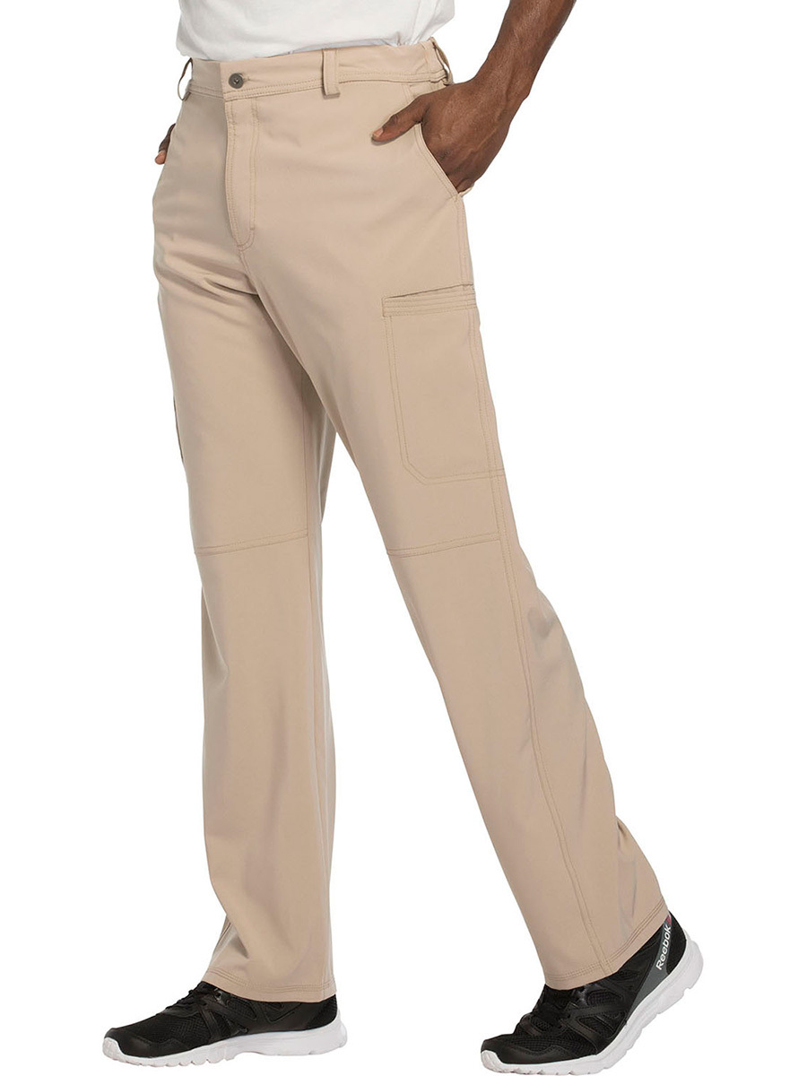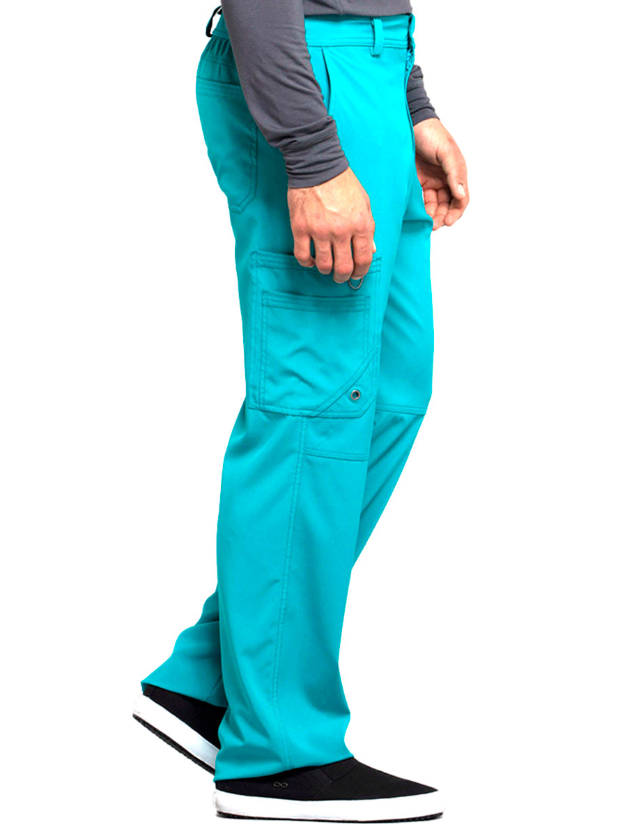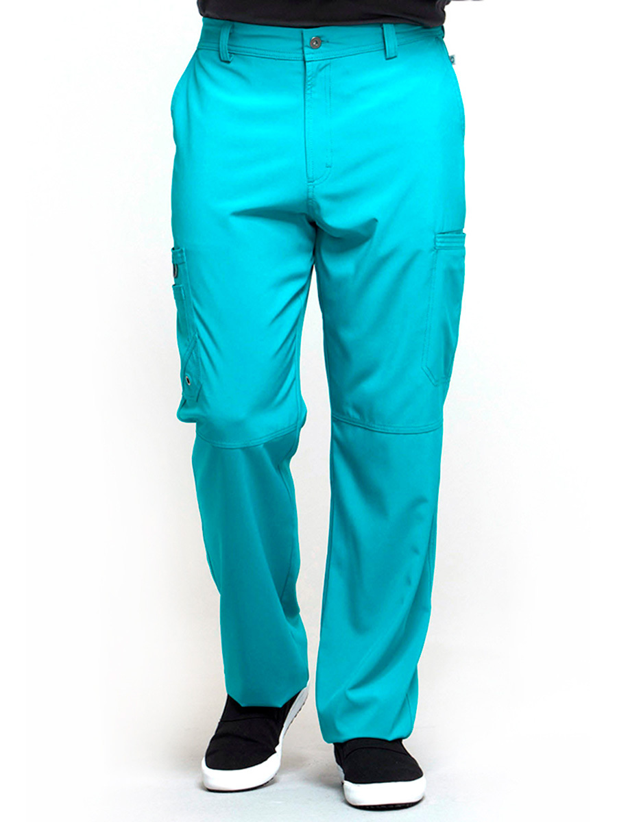 Мужские медицинские брюки Cherokee CK200A с зауженными штанинами имеют внутреннюю функциональную кулиску, эластичный пояс сзади с ребристой вязкой, пять шлевок для ремня, ширинку на молнии с застежкой на пуговицы и потайную ластовицу во внутреннем шве для дополнительного удобства. Изделие дополнено двумя передними угловыми карманами, правым двойным грузовым карманом с петлей для бейджа, левым прорезным грузовым карманом и задним накладным карманом.