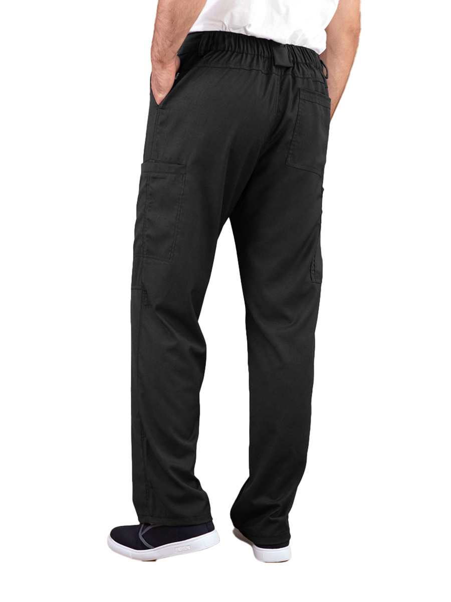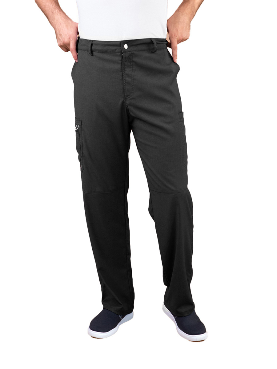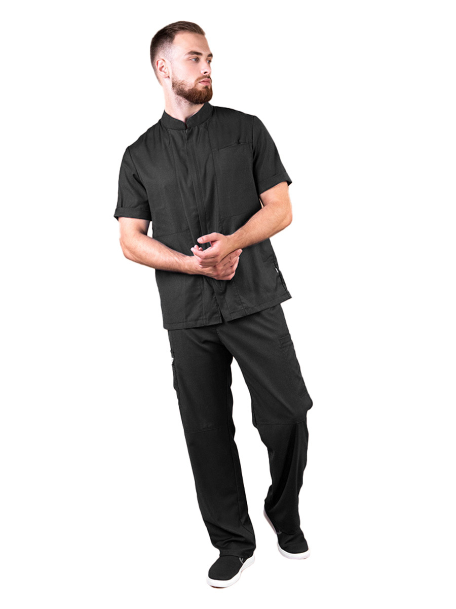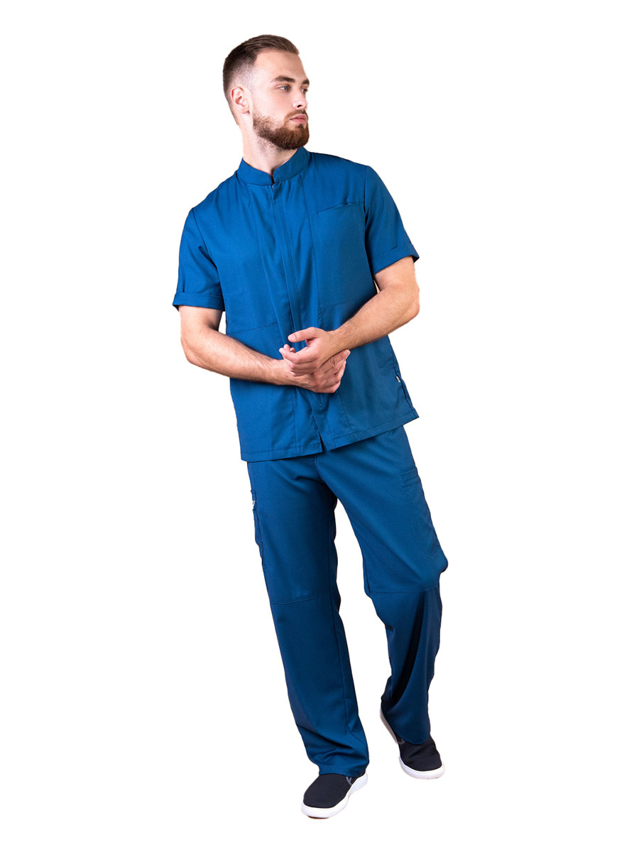 Мужские медицинские брюки TZ610 бренда Tezis имеют прямой силуэт, функциональную внутреннюю кулиску, эластичный пояс с резинкой на спине, пять шлевок для ремня, ширинку на молнии с застежкой на пуговицу. Изделие дополнено шестью карманами: два передних боковых, правый двойной накладной с эластичной петлей и люверсом, левый прорезной и задний накладной.