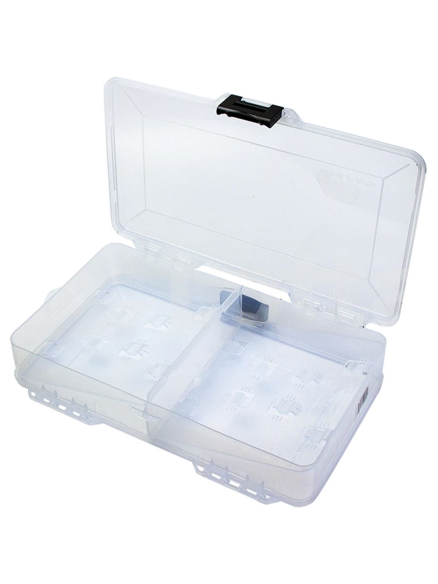Продуманная конструкция обеспечивает оптимальное размещение всех необходимых аксессуаров. Каждая сторона коробки разделена на два вертикальных отсека разного размера. Большой отсек предназначен для хранения блистерных упаковок с приманками и различных инструментов. Малый отсек дополнительно разделен на три ячейки для аккуратного размещения крючков и мелкой фурнитуры. Такая конструкция обеспечивает удобство использования и хранения содержимого, а также гарантирует долговечность и надежность эксплуатации изделия.