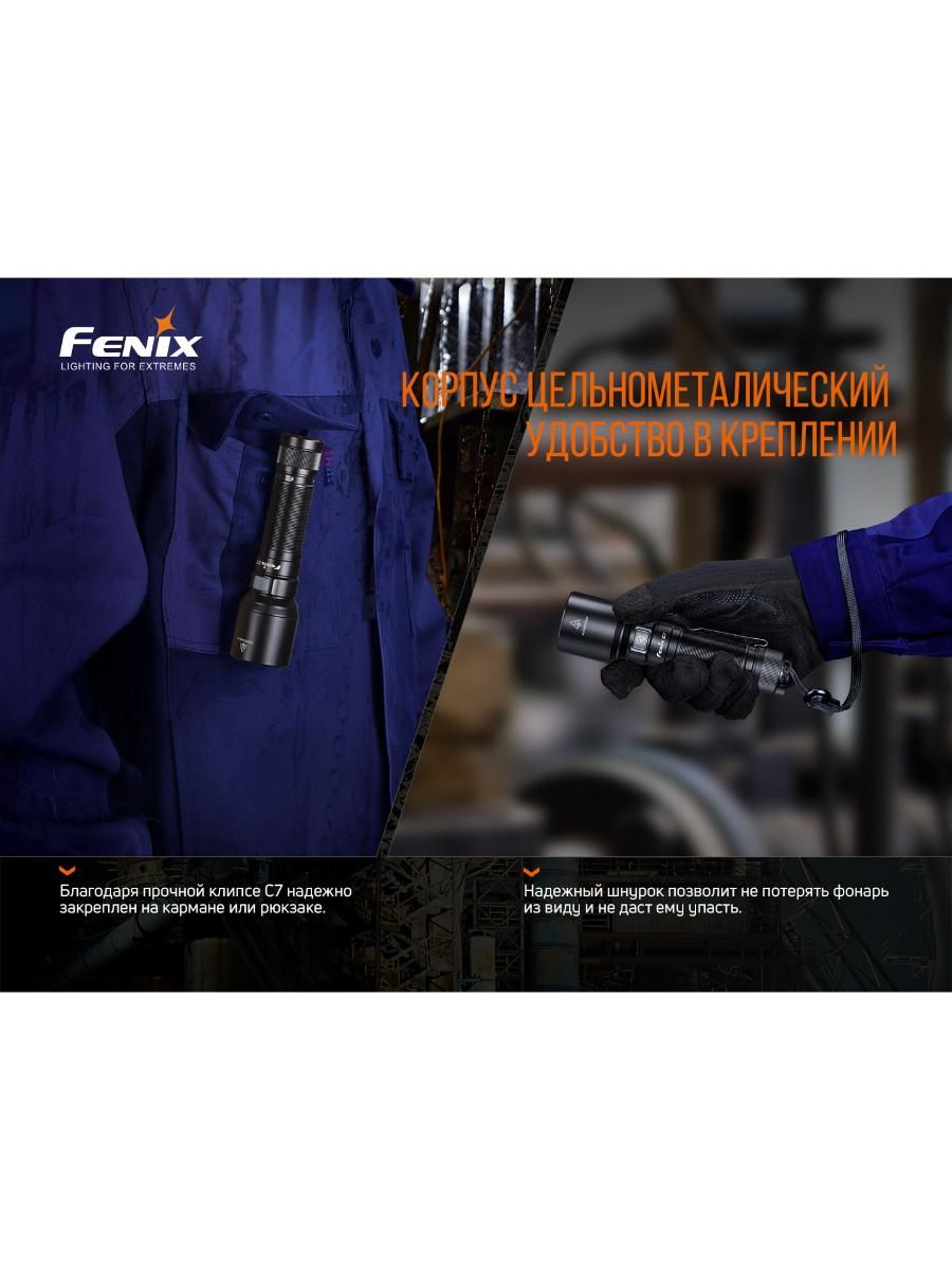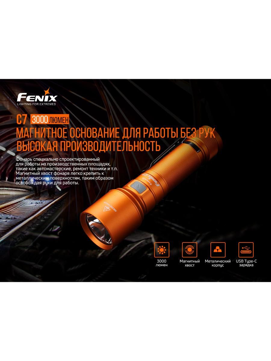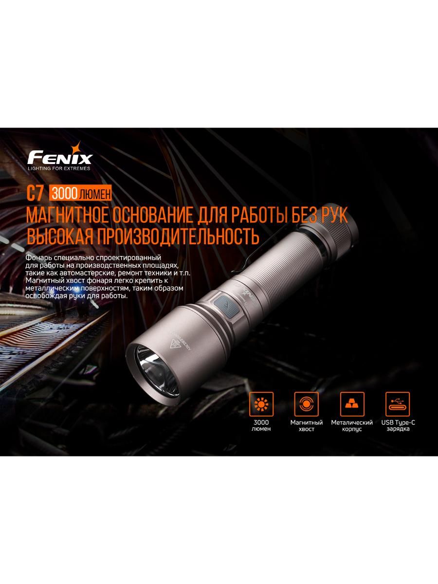Фонарь Fenix C7 – высокопроизводительная ручная модель для промышленного обслуживания и применения. Зарядка осуществляется при помощи USB Type-C с включённой литий-ионной батареей ёмкостью 5000 мАч. Способен давать наибольшую яркость освещения в 3000 люменов в турбо-режиме при дистанции луча до 470 метров.