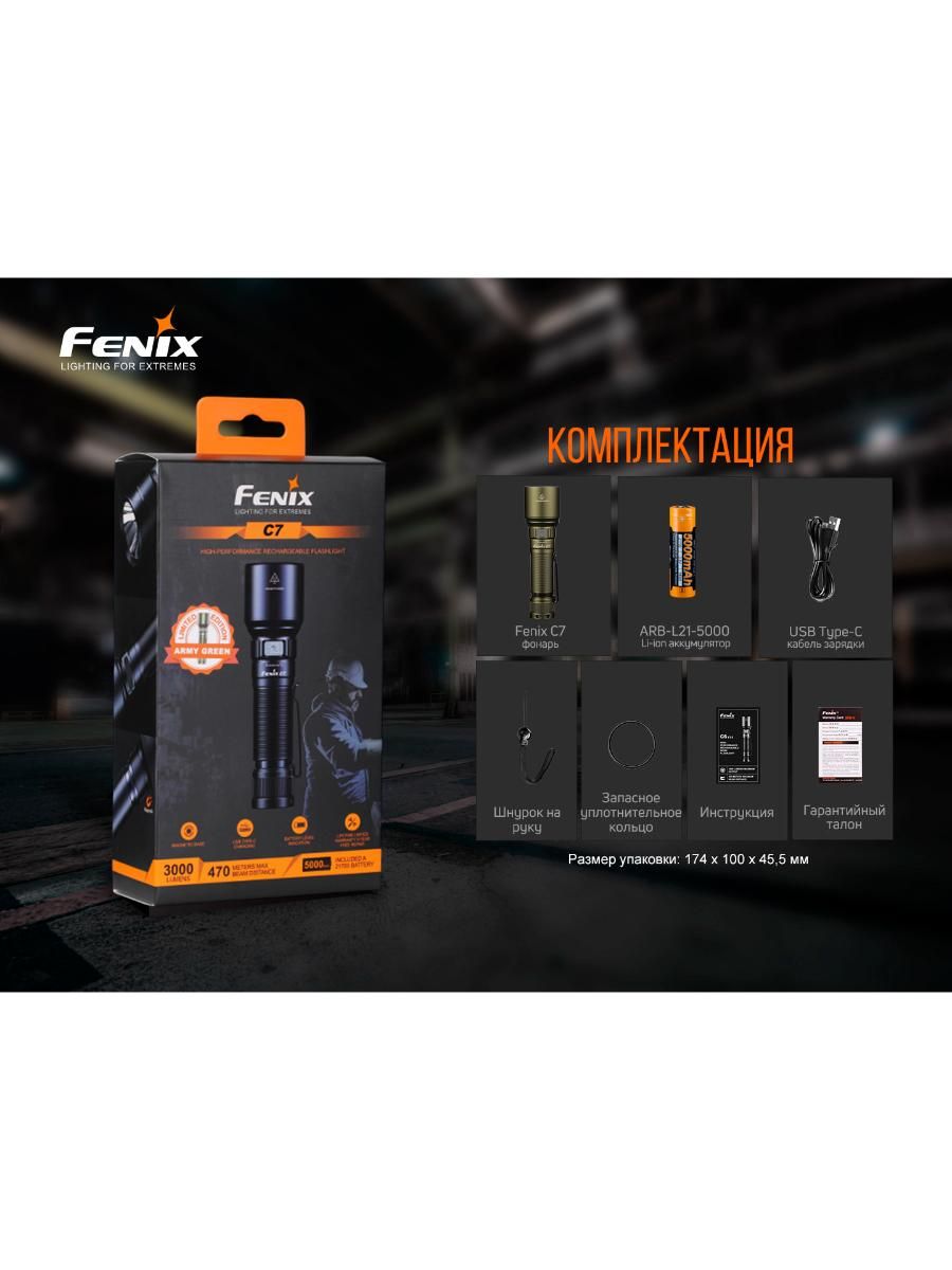 фонарь Fenix C7, батарея литий-ионная Fenix ARB-L21-5000, кабель для зарядки USB Type-C, темляк, запасное уплотнительное кольцо, руководство пользователя