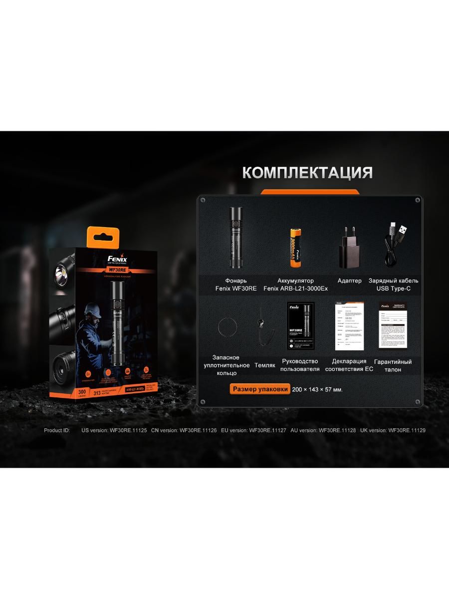 фонарь Fenix WF30RE 2025, аккумулятор ARB-L21-3000Ex, зарядный адаптер, зарядный кабель Type-C, запасное уплотнительное кольцо, темляк, декларация соответствия ЕС, руководство пользователя
