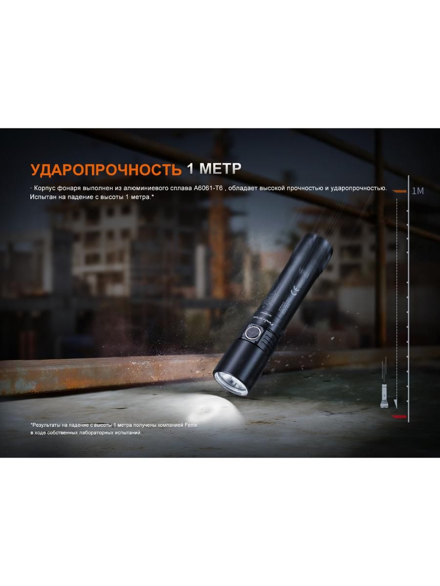 Корпус выполнен из прочного алюминиевого сплава A6061-T6, устойчивого к коррозии и механическим повреждениям. Фонарь имеет степень защиты IP68, что означает полную пыленепроницаемость и возможность погружения под воду на глубину до 2 метров. Ударопрочность до 1 метра гарантирует сохранность фонаря при падении или вибрации во время работы.