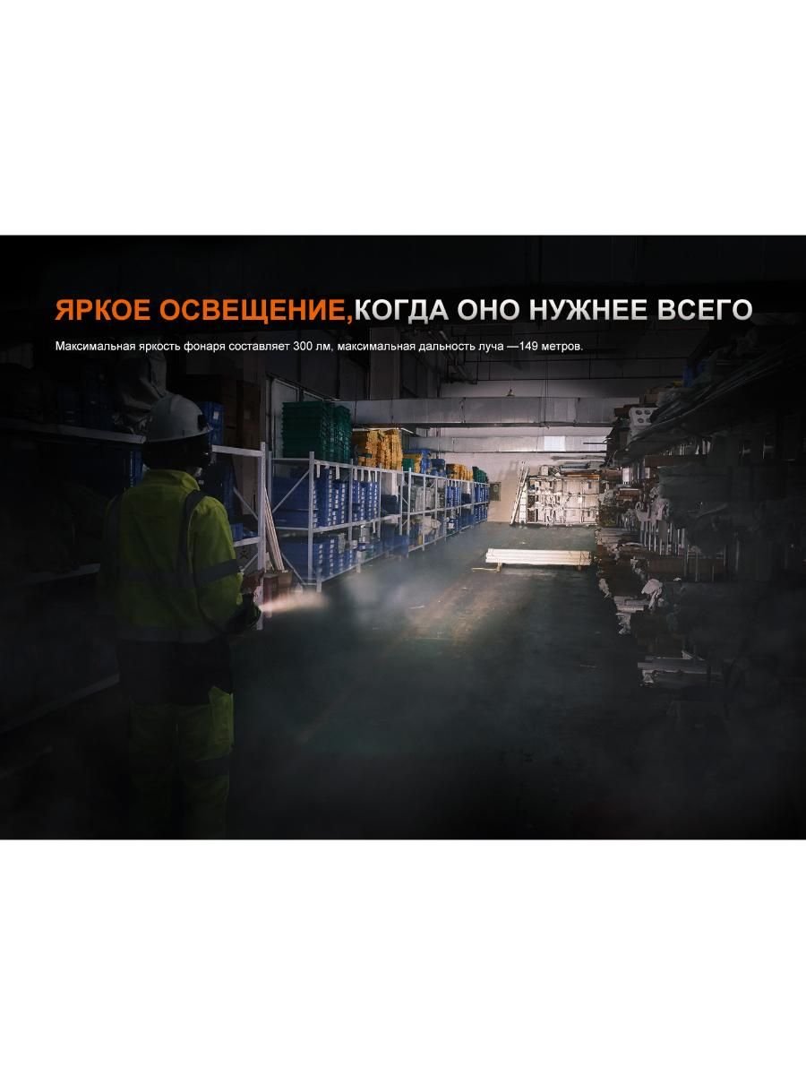 Фонарь Fenix WF30RE 2025 оснащен современным светодиодом CREE XP-G3 с ресурсом службы 50 000 часов и с цветовой температурой 5000 K. Максимальная яркость составляет 300 люмен, а дальность освещения достигает 149 метров при интенсивности света 5572 кд. Модель поддерживает пять режимов работы, что позволяет подобрать оптимальный режим для любых задач — от точечных осмотров до длительного освещения на дежурстве.