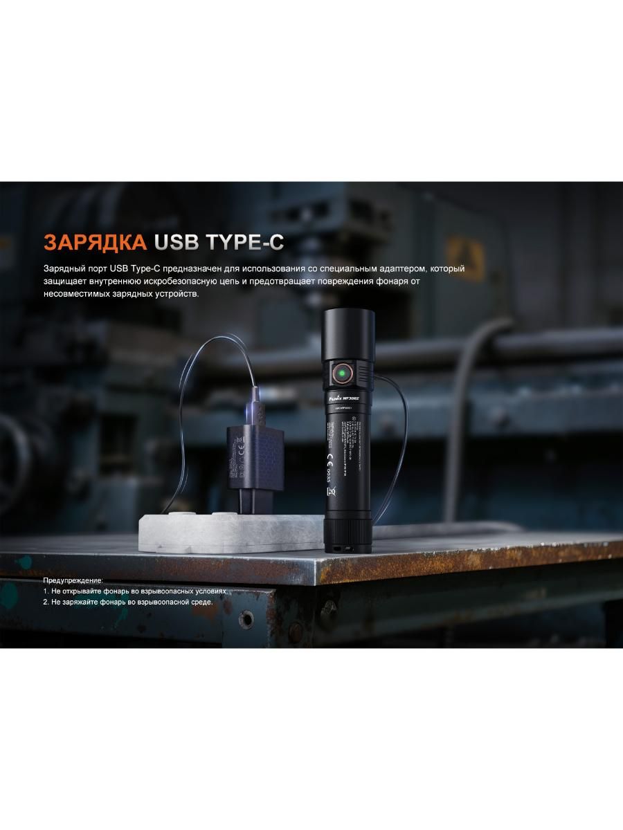 Питание обеспечивается взрывозащищенным аккумулятором Fenix ARB-L21-3000Ex формата 21700 емкостью 3000 мА·ч. Зарядка производится через порт USB Type-C с безопасным адаптером, входящим в комплект. Максимальное время работы фонаря в экономичном режиме составляет более 13 дней, что делает его надежным источником света при аварийных ситуациях.