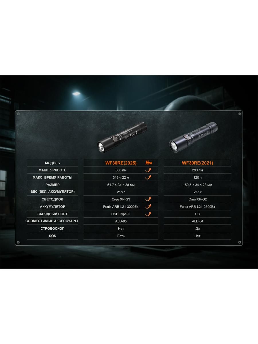 Fenix WF30RE 2025 — это надежный профессиональный инструмент, сочетающий высокую прочность, энергоэффективность и продуманную систему безопасности. Он станет незаменимым помощником для специалистов, работающих в сложных промышленных условиях, обеспечивая стабильное освещение и уверенность в любой ситуации.