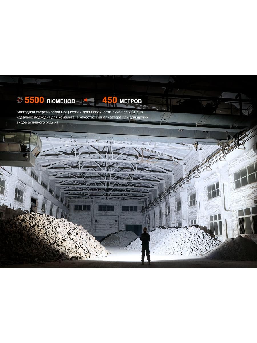 Фонарь Fenix CP50R - это самый яркий кемпинговый фонарь, выдающий до 5500 люмен и освещающий пространство на дистанции до 450 метров. Такая мощность делает его эффективным в аварийных ситуациях, на строительных площадках и в условиях, где требуется предельно высокая яркость.