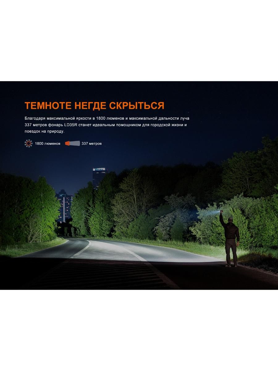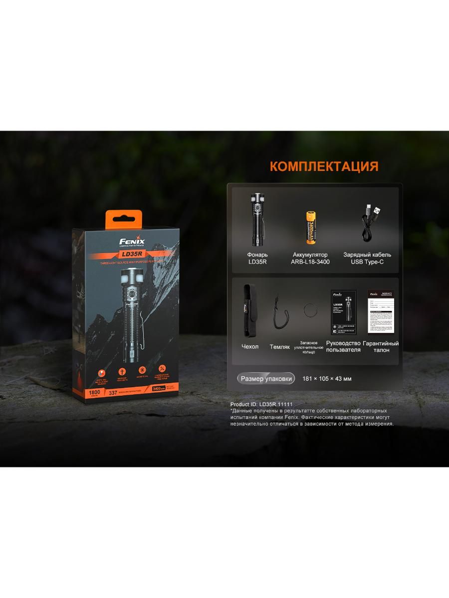 фонарь Fenix LD35R, аккумулятор Fenix ARB-L18-3400, темляк, чехол, кабель Type-C, запасное уплотнительное кольцо, руководство пользователя