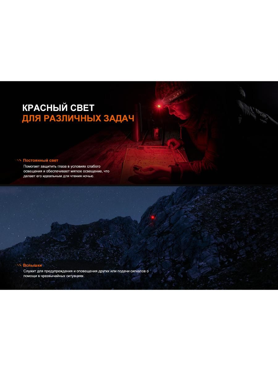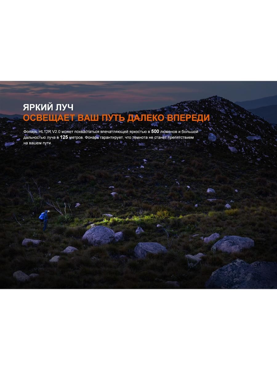 В LED-фонаре установлены два светодиода — белый Luminus SST20 и красный 2835. Срок службы каждого из светодиодов составляет 50 000 часов. Фонарь обеспечивает максимальную яркость света в 500 люменов и дальнобойность луча до 125 метров. Благодаря четырем режимам белого и двум режимам красного света Fenix HL12R V2.0 обеспечивает универсальное освещение для самых различных ситуаций. Белый свет не позволит вам заблудиться в темноте, а красный защитит зрение во время чтения ночью. Также красный свет не привлекает насекомых, что особенно удобно при отдыхе на природе.