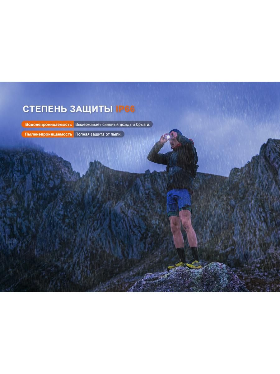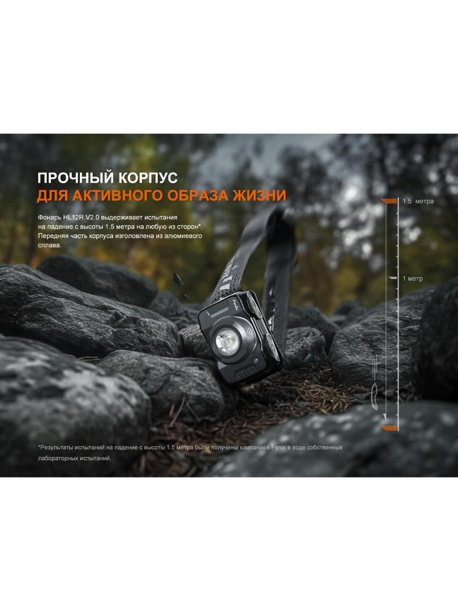Аккумуляторный налобный фонарь обладает защитой от воды и пыли IP66. Это значение показывает, что устройство полностью защищено от попадания пыли внутрь корпуса и может использоваться во время дождя. Ударопрочность Fenix HL12R V2.0 составляет 1.5 метра. Передняя часть фонаря выполнена из прочного алюминиевого сплава.
