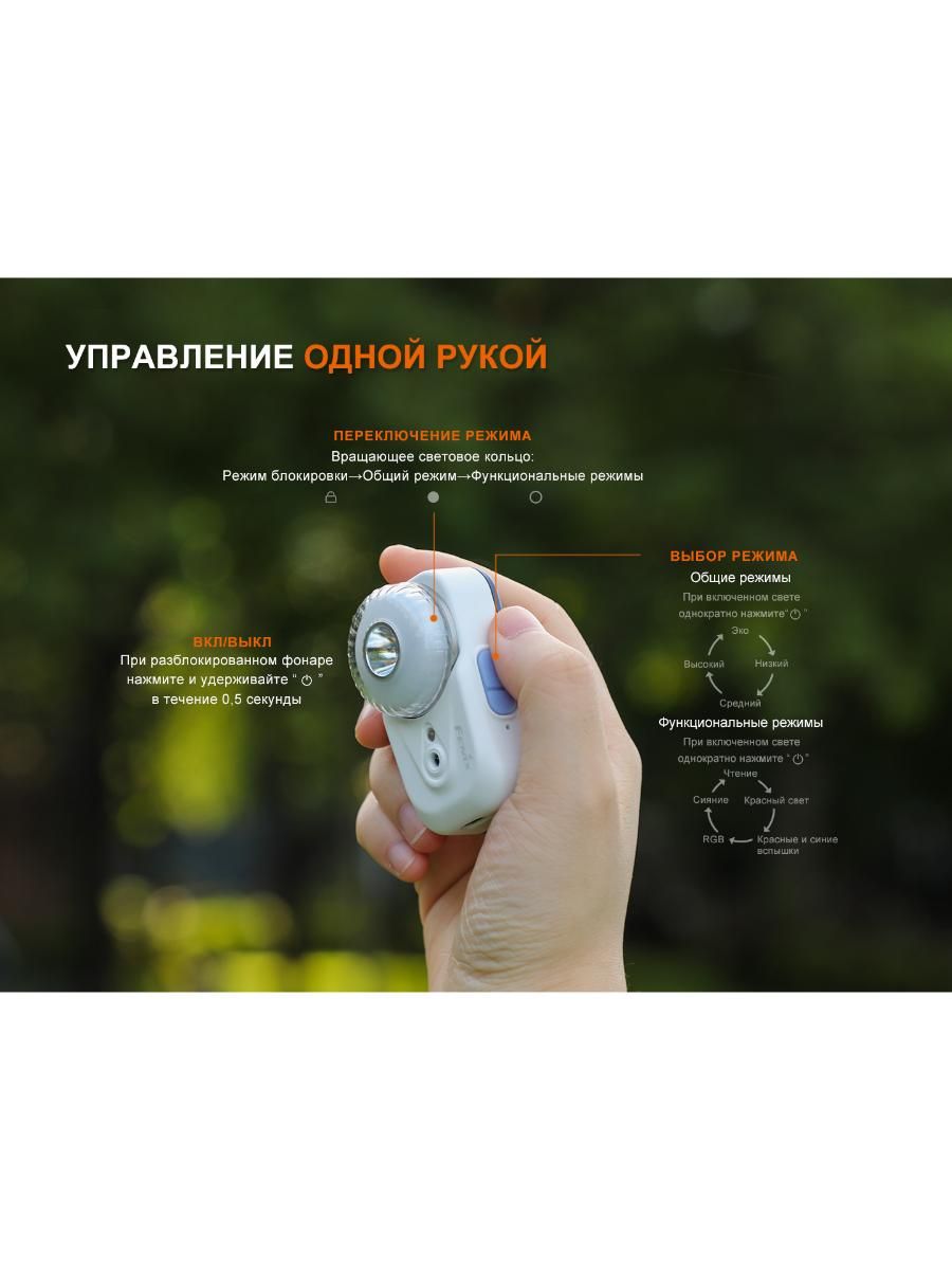 Управлять беговым фонарем легко и интуитивно понятно. Два переключателя и поворотное кольцо позволяют быстро менять режимы даже в перчатках, а функция управления жестами даст возможность включить или выключить фонарь простым движением руки даже во время движения. Есть и блокировка от случайного включения — HL17R никогда не разрядится в рюкзаке.