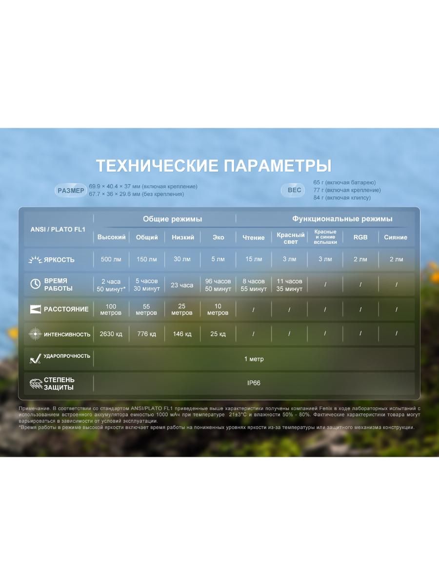 размеры фонаря — 69,9 × 40,4 × 37 мм (включая крепление);