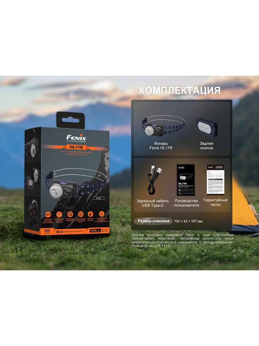 фонарь Fenix HL17R, задняя клипса, кабель Type-C, зажимы для кабеля х2, руководство пользователя, гарантийный талон