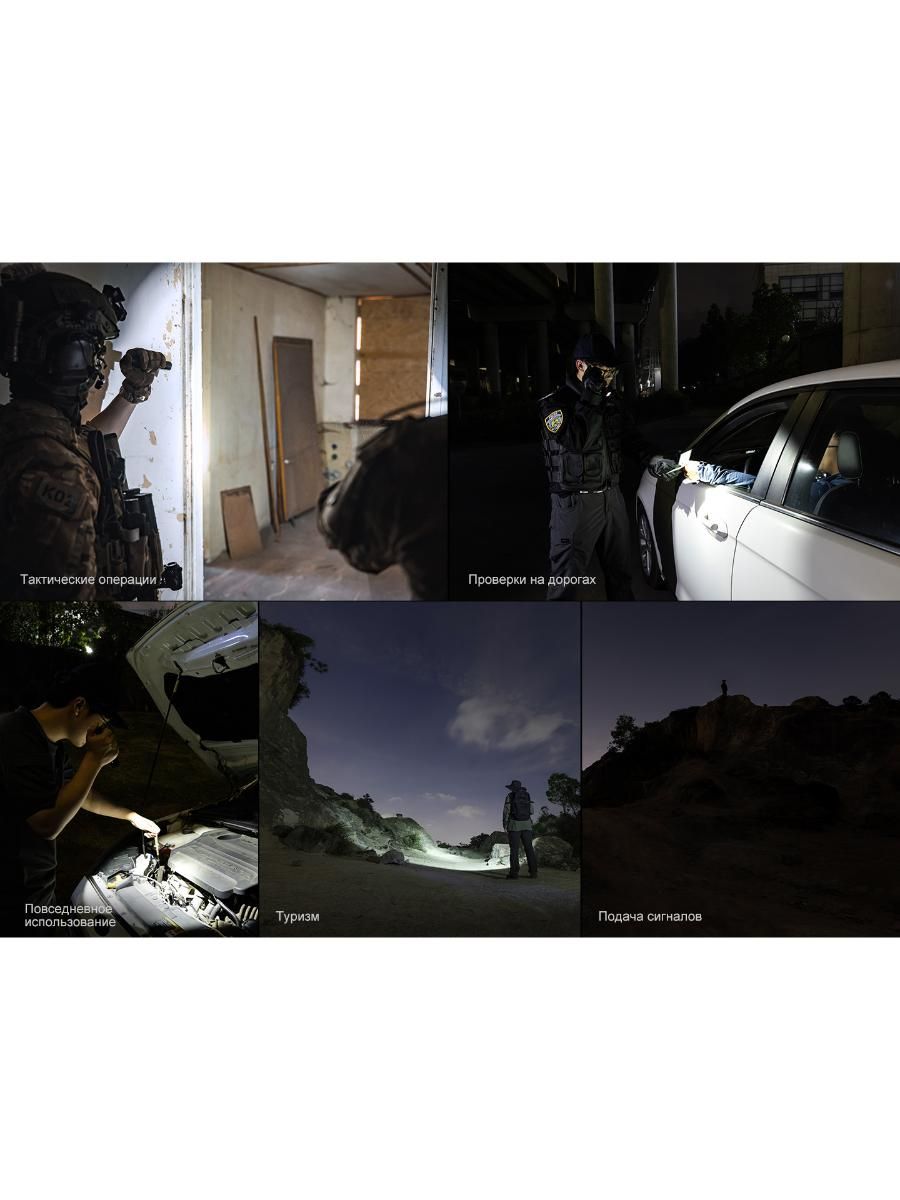 Управление реализовано через двойную систему: тактический хвостовой переключатель позволяет включать и выключать фонарь моментально, а боковая кнопка отвечает за смену режимов яркости и активацию стробоскопа и режима SOS. Также предусмотрен переключатель SET, который позволяет выбрать нужный сценарий работы, включить и выключить функцию стробоскопа.