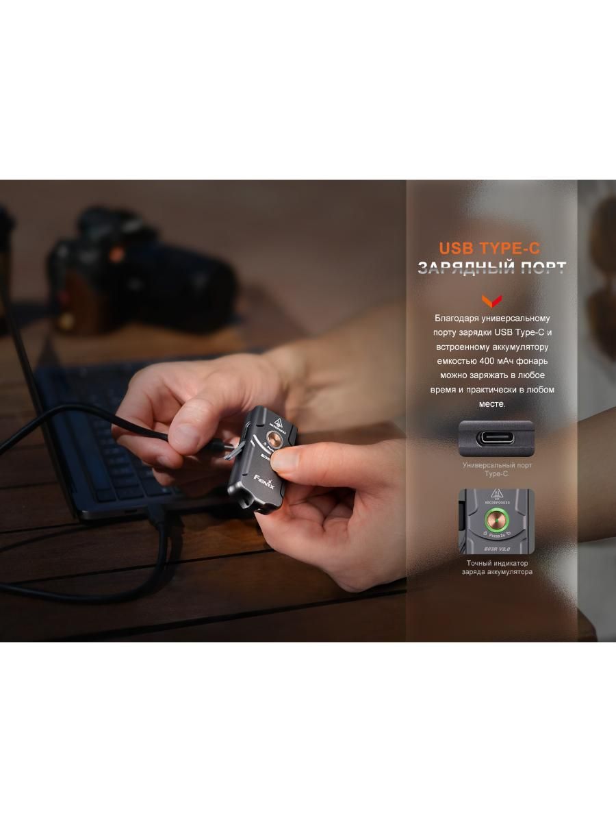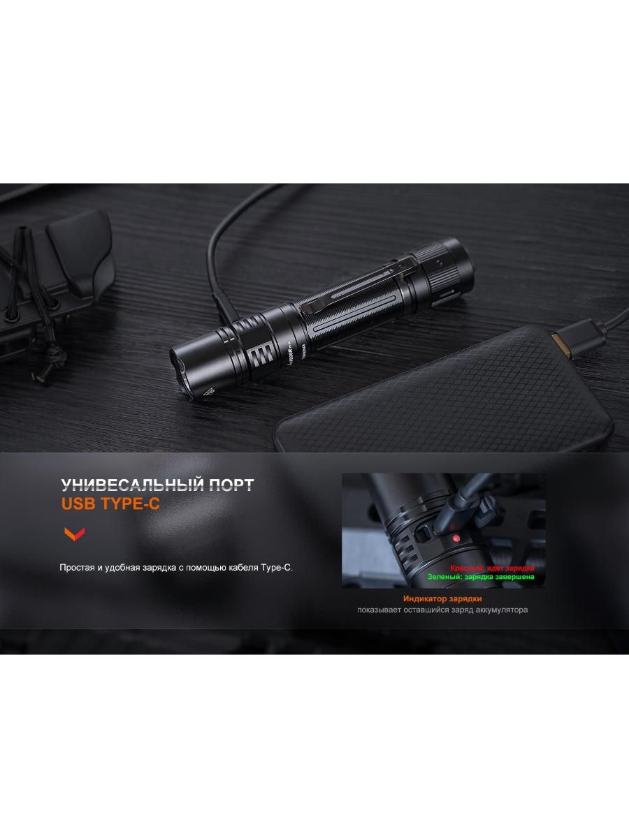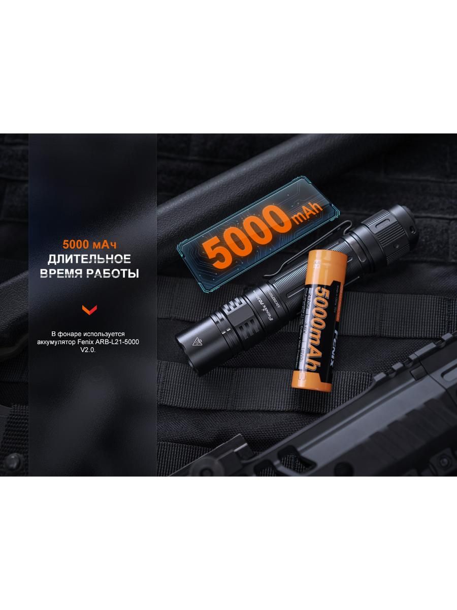 Питание: фонарь работает от перезаряжаемого аккумулятора Fenix ARB-L21-5000 V2.0 (формат 21700, 5000 мАч), который входит в комплект.Зарядка производится через скрытый порт USB-C, полный цикл занимает около 3 часов. При этом есть индикация уровня заряда при включении фонаря, что позволяет быстро оценить, сколько энергии осталось.
