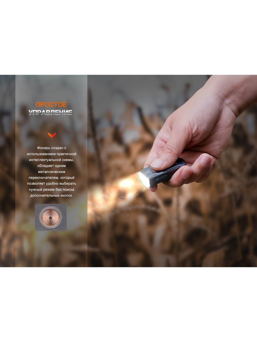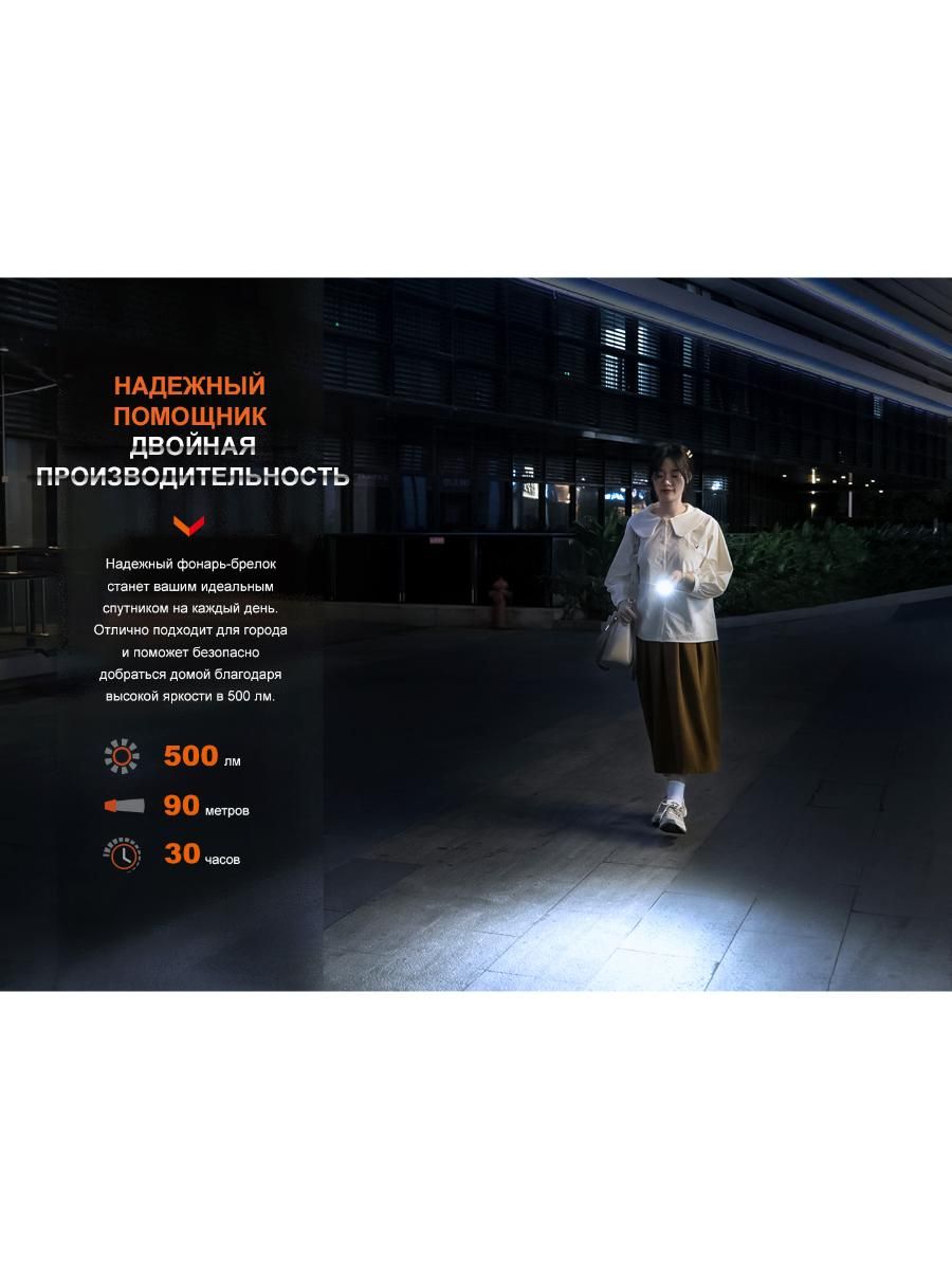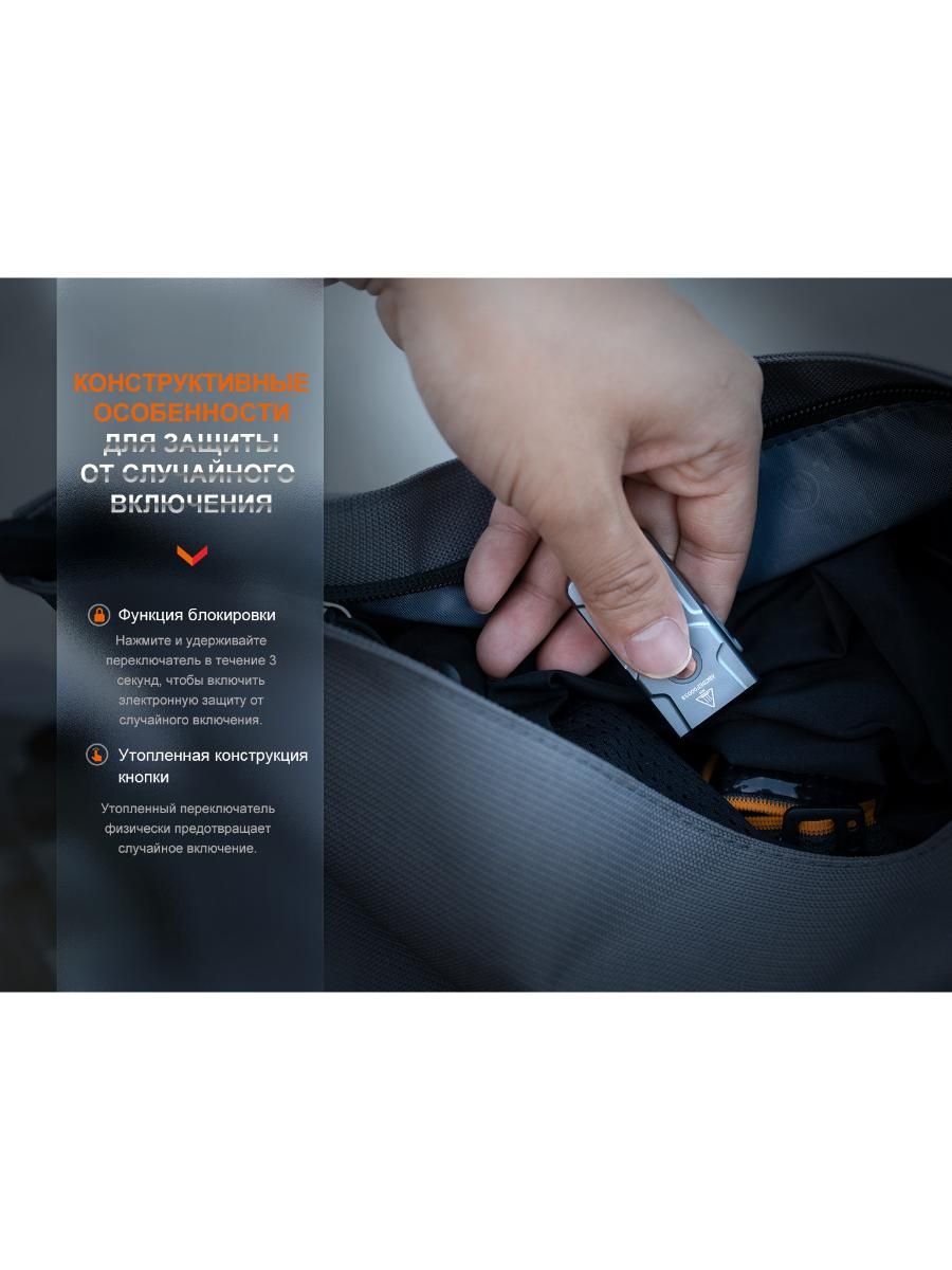 Питание: фонарь работает от перезаряжаемого аккумулятора Fenix ARB-L21-5000 V2.0 (формат 21700, 5000 мАч), который входит в комплект.Зарядка производится через скрытый порт USB-C, полный цикл занимает около 3 часов. При этом есть индикация уровня заряда при включении фонаря, что позволяет быстро оценить, сколько энергии осталось.