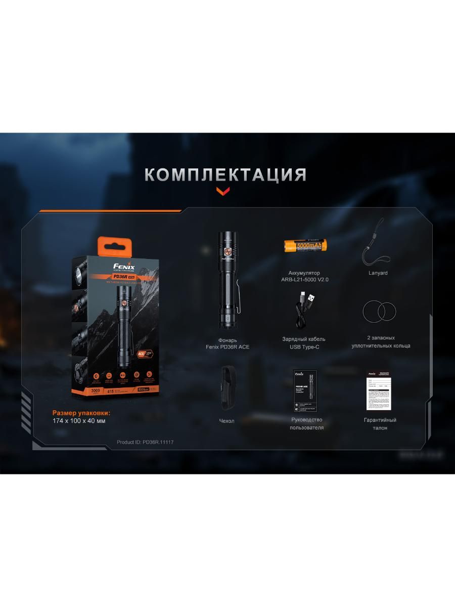 В комплект входят: фонарь PD36R ACE, аккумулятор ARB-L21-5000 V2.0, зарядный кабель USB-C, чехол, шнурок (lanyard), два запасных уплотнительных кольца.