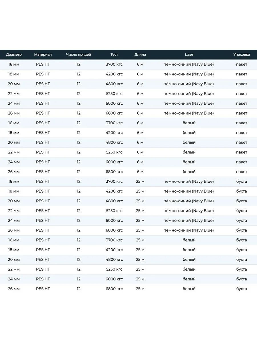 Упаковка. Канат доступен по 6 м (в пакетах) и по 25 м (в бухтах).