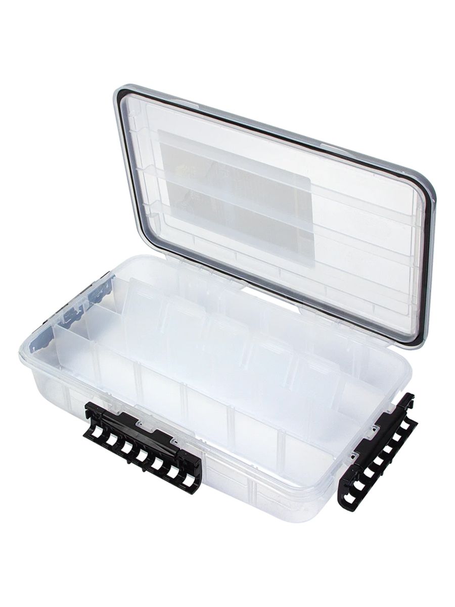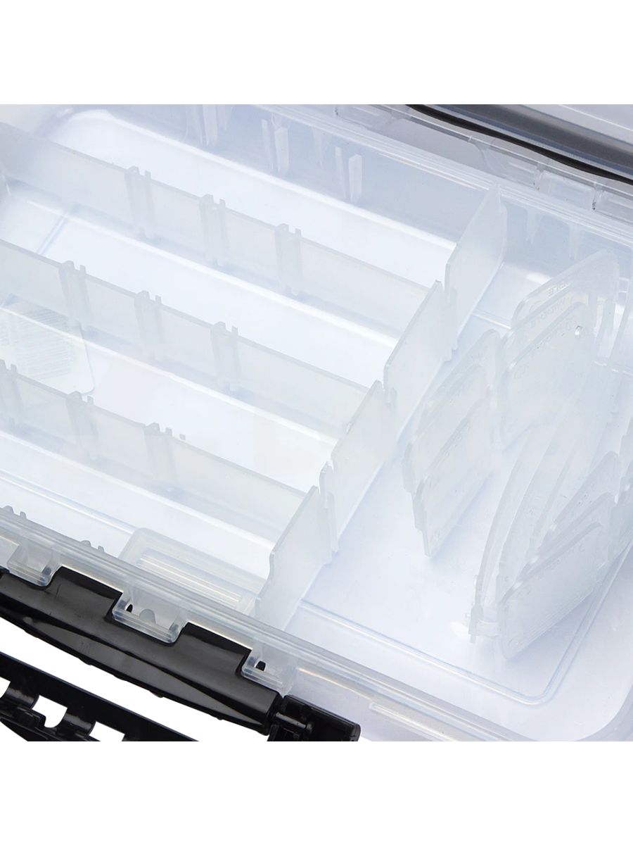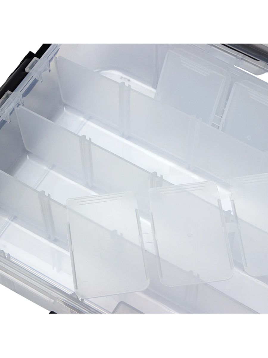 Модульная система с регулируемыми перегородками дает возможность гибко зонировать внутреннее пространство под конкретные потребности. В отдельных отсеках удобно хранить приманки, элементы оснастки и различные инструменты, обеспечивая быстрый доступ к каждому предмету. Прозрачные стенки значительно упрощают поиск нужных предметов – содержимое отлично просматривается, что экономит время при выборе необходимых аксессуаров.