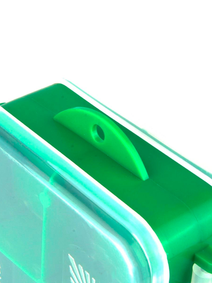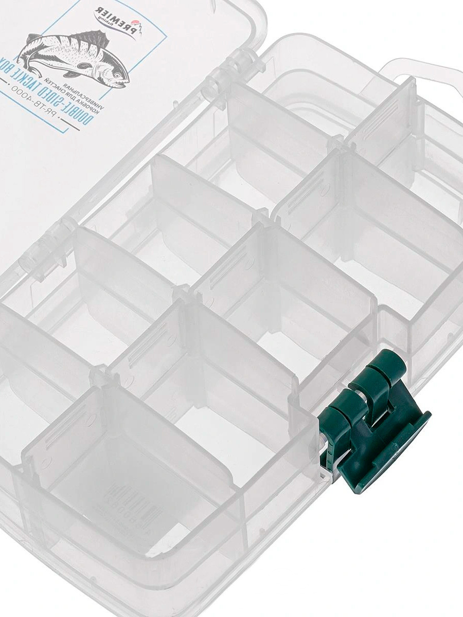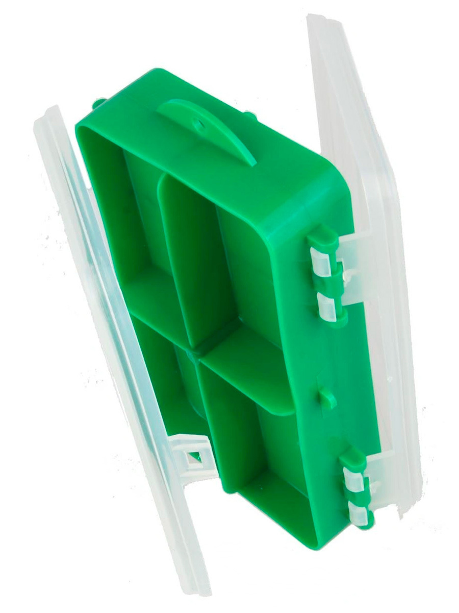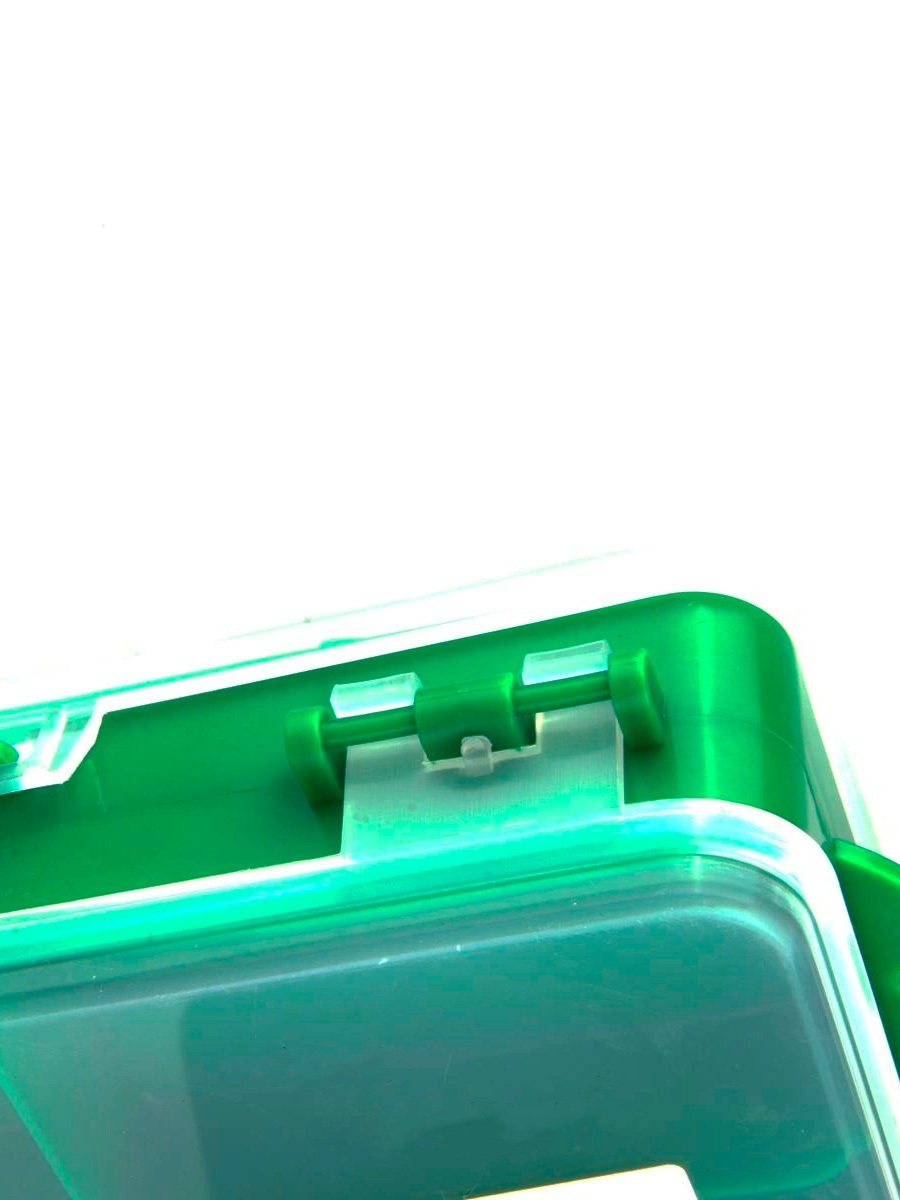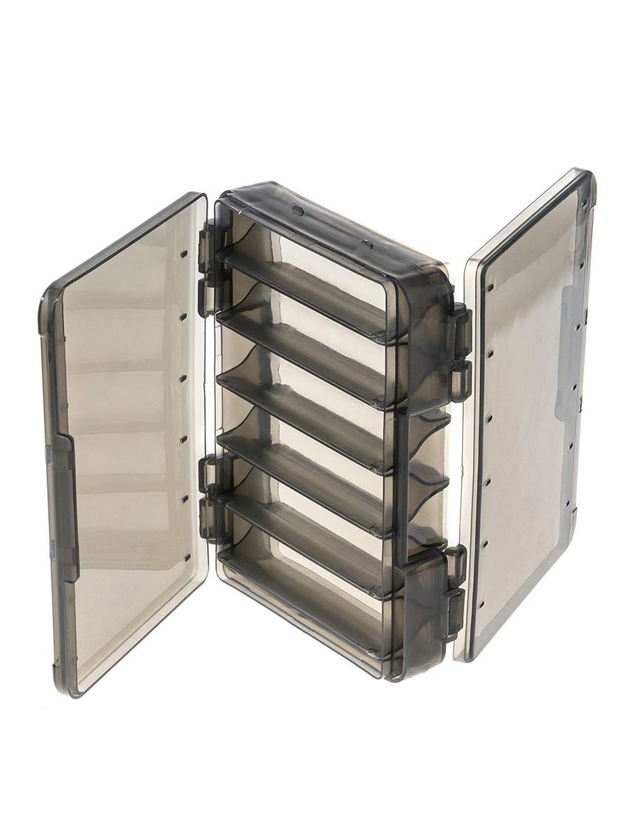 Удобная двухсекционная коробка под снасти, открывается книжкой.