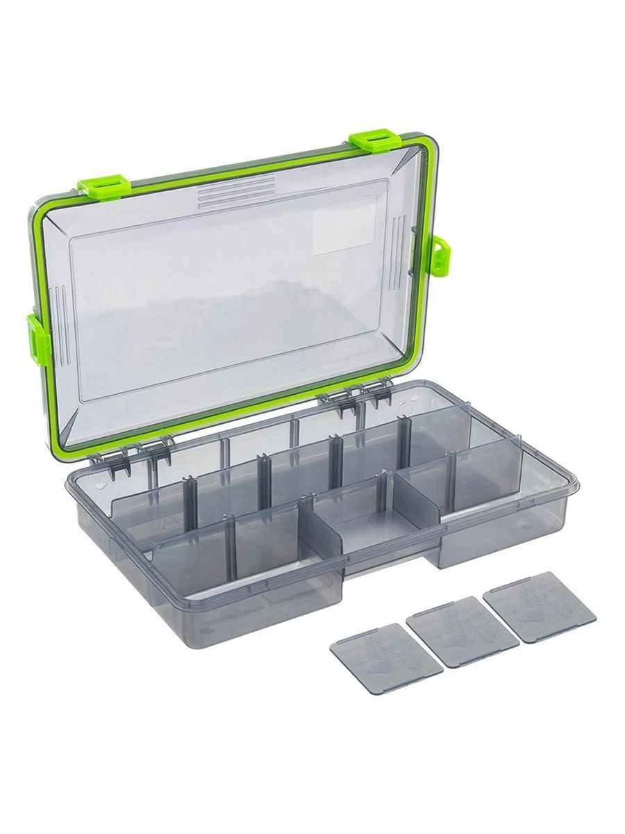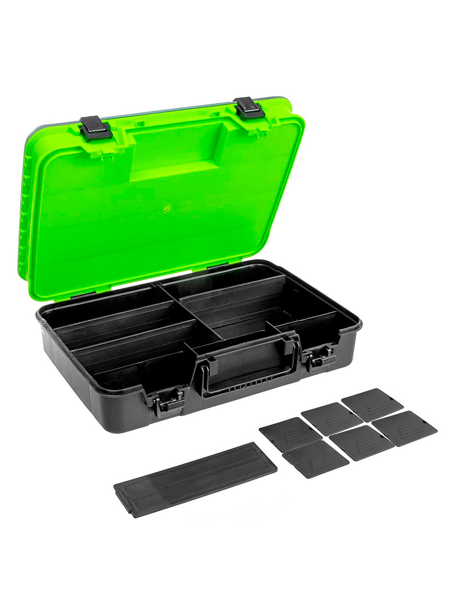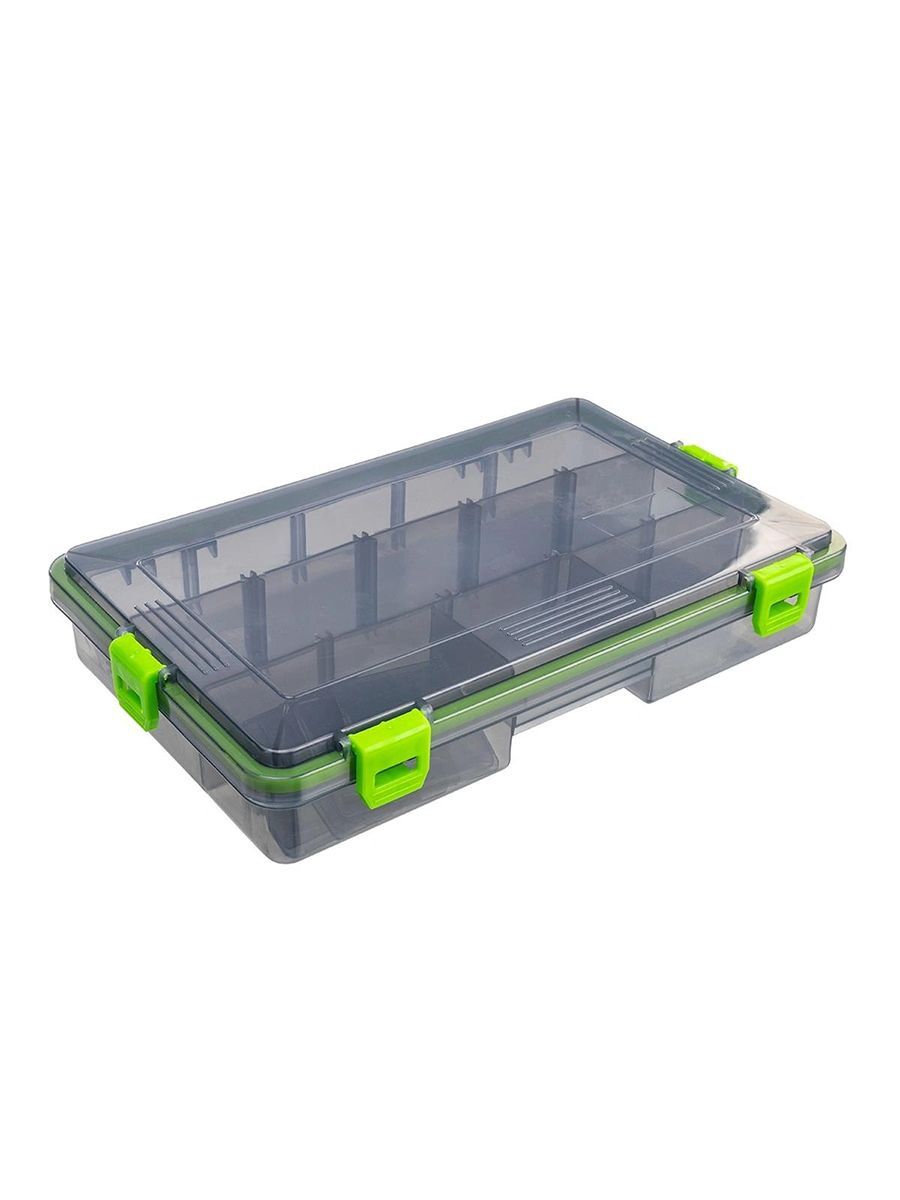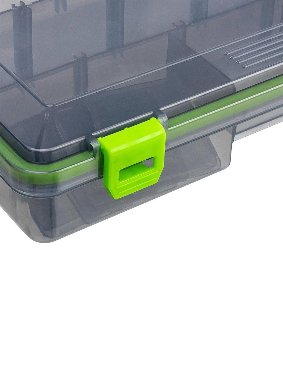 Коробка выполнена в виде кейса, в нижней части которого расположены отделения под рыболовные снасти. Крышка коробки оснащена уплотнительной резиновой лентой, которая позволяет сохранить содержимое сухим. Четыре защелки надежно фиксируют коробку в закрытом состоянии.
