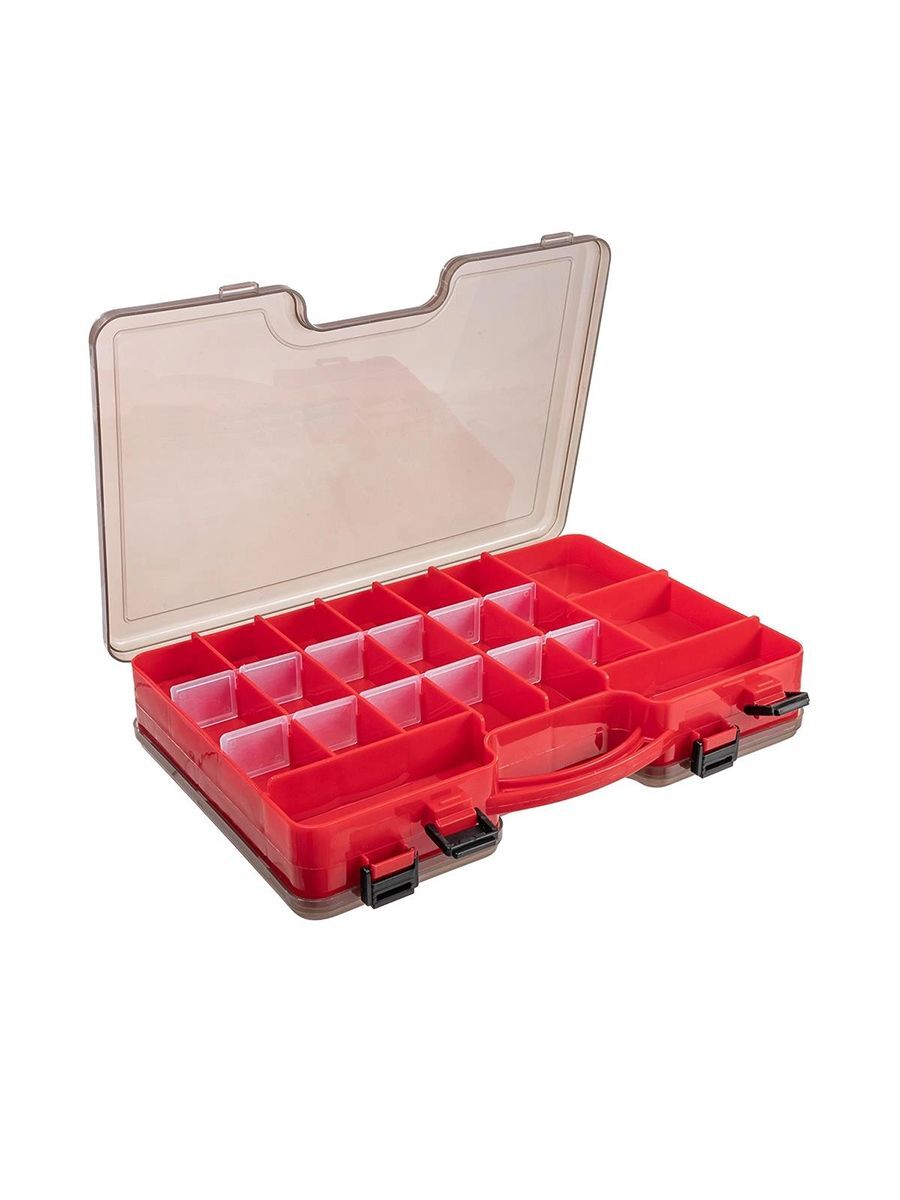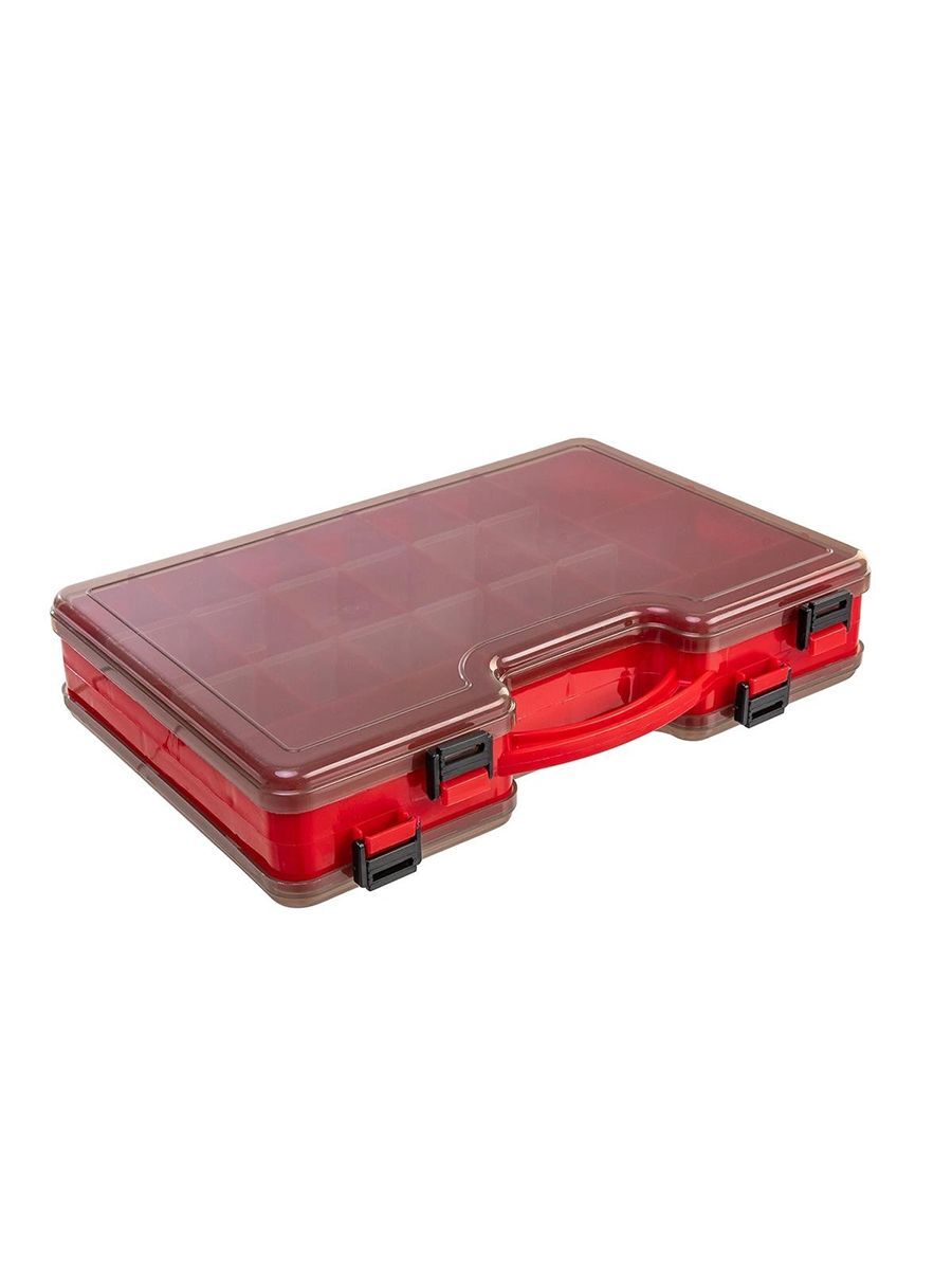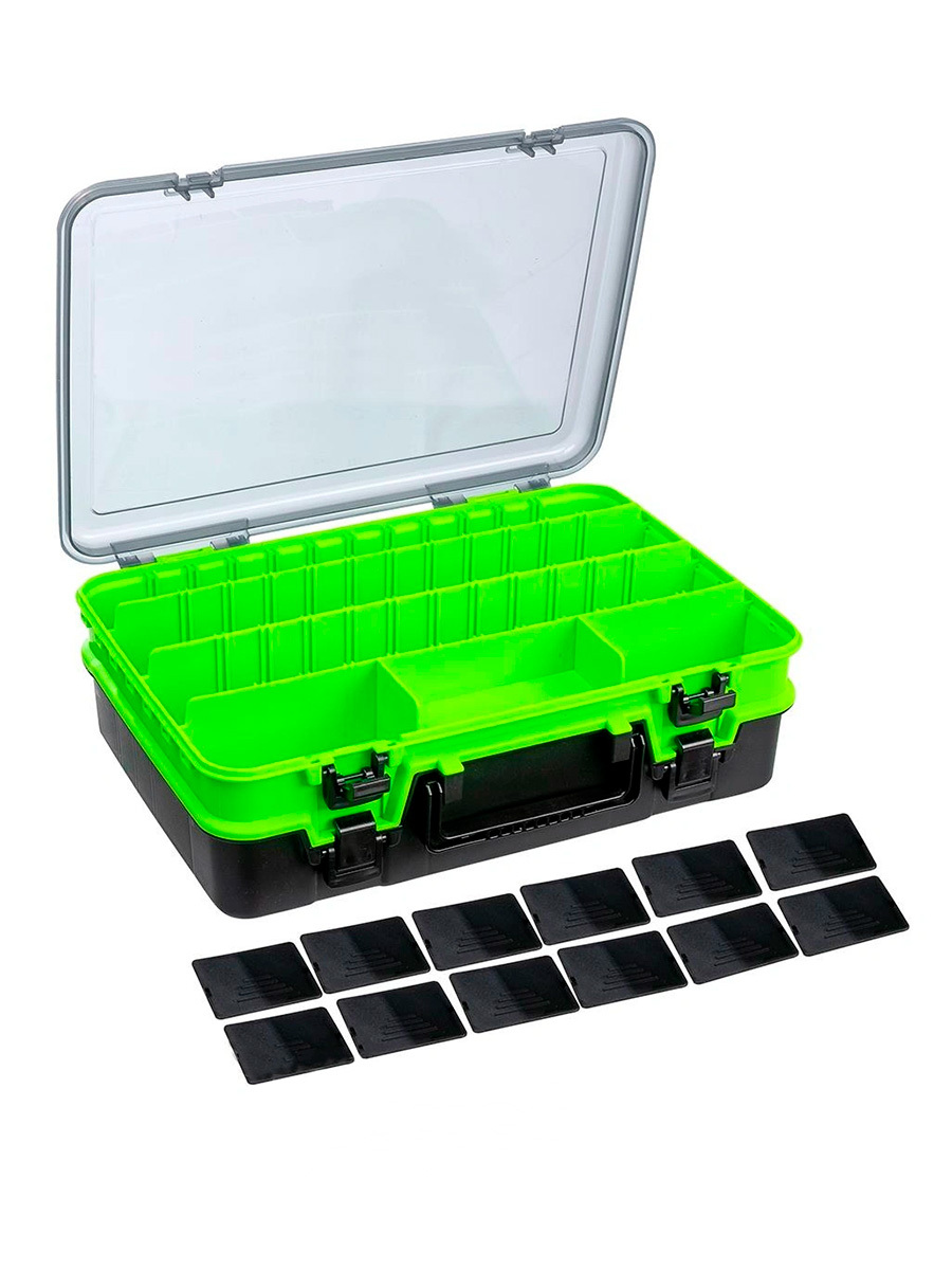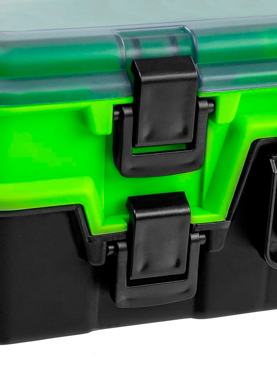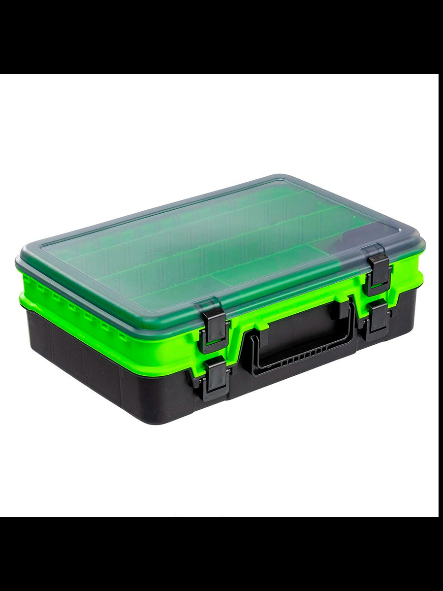 Коробка выполнена в виде кейса, в нижней части которого расположены отделения под рыболовные снасти. Крышка коробки оснащена уплотнительной резиновой лентой, которая позволяет сохранить содержимое сухим. Четыре защелки надежно фиксируют коробку в закрытом состоянии.