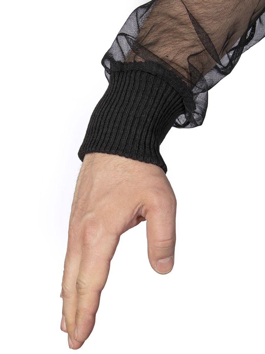 На рукавах плотно прилегает к запястьям манжетами, которые мешают так же проникновению клещей к телу.