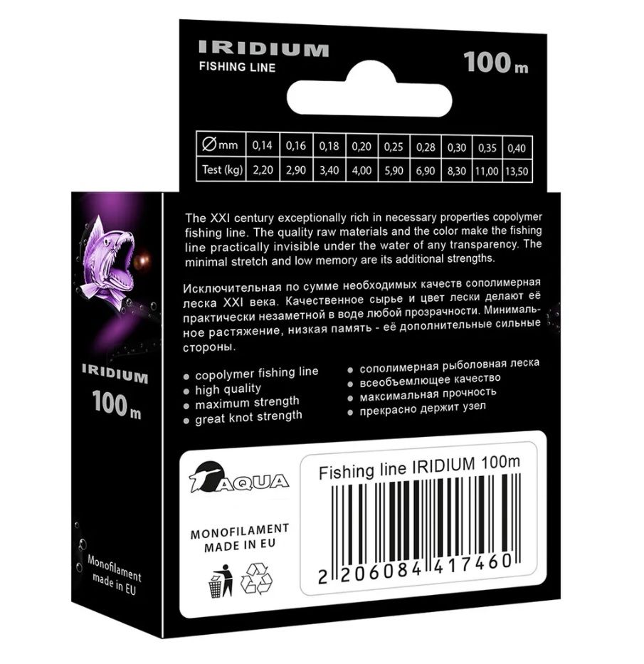- Леска AQUA IRIDIUM выпускается в голубом цвете, в диаметрах от 0,16 до 0,40mm, что позволит подобрать подходящий вариант для любого вида ловли, будь то матчевая удочка, фидерное удилище, спиннинг или троллинговая снасть.
