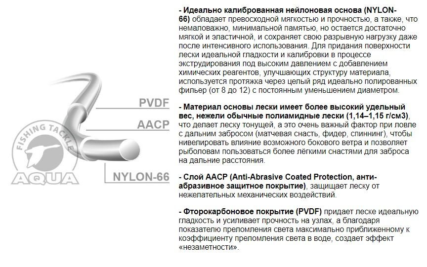 - Слой AACP (Anti-Abrasive Coated Protection, анти-абразивное защитное покрытие), защищает леску от нежелательных механических воздействий.