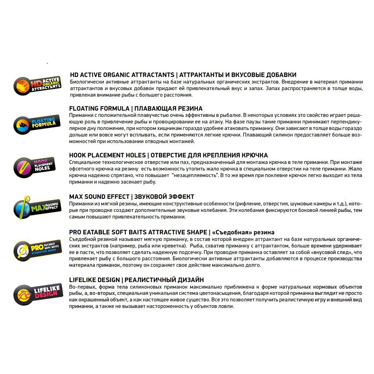 Форма тела силиконовых приманок максимально приближена к форме натуральных кормовых объектов рыбы. Специальная уникальная система цветонасыщения, благодаря которой приманка выглядит, как настоящее живое существо. Все это позволяет получить реалистичную игру и внешний вид приманки, а также не вызывает настороженность у объектов ловли.