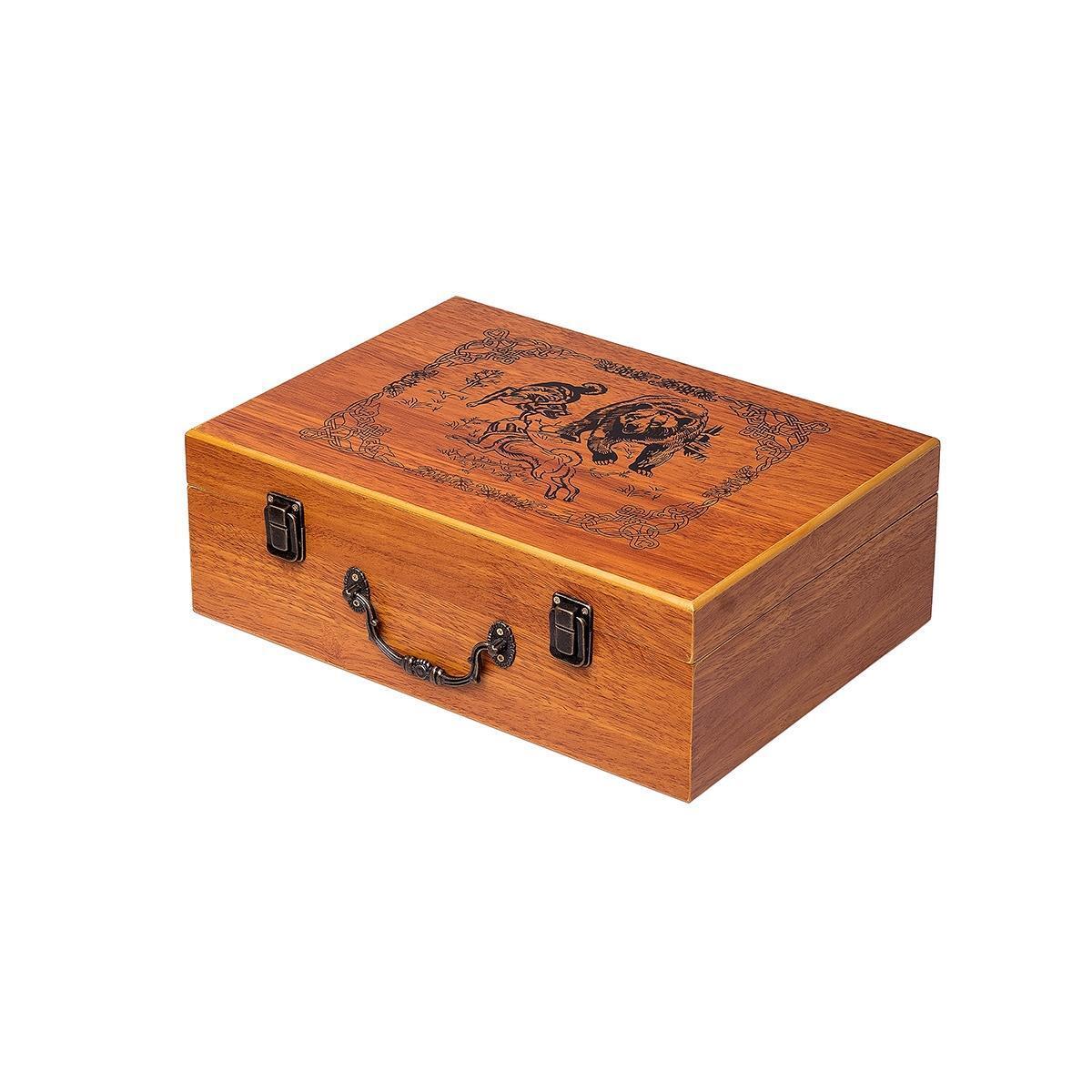 Подарочный набор в деревянном чемодане. Поверхность чемодана покрыта лаком, нанесен рисунок и узор. Чемодан закрывается на защелки, имеет удобную ручку. Внутри крышка чемодана оснащена фиксаторами на кнопке для предметов набора. Имеется дополнительный фиксатор, предназначенный для салфеток*.