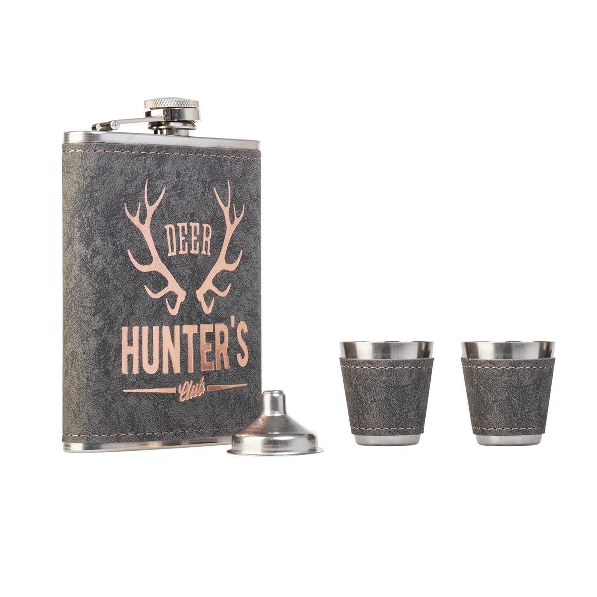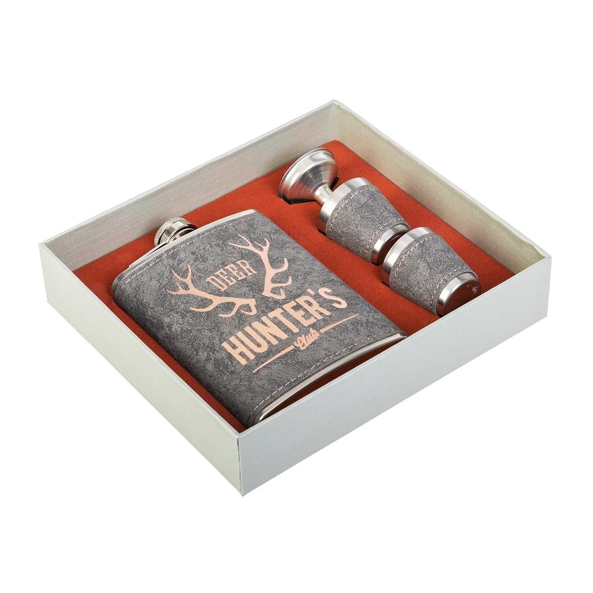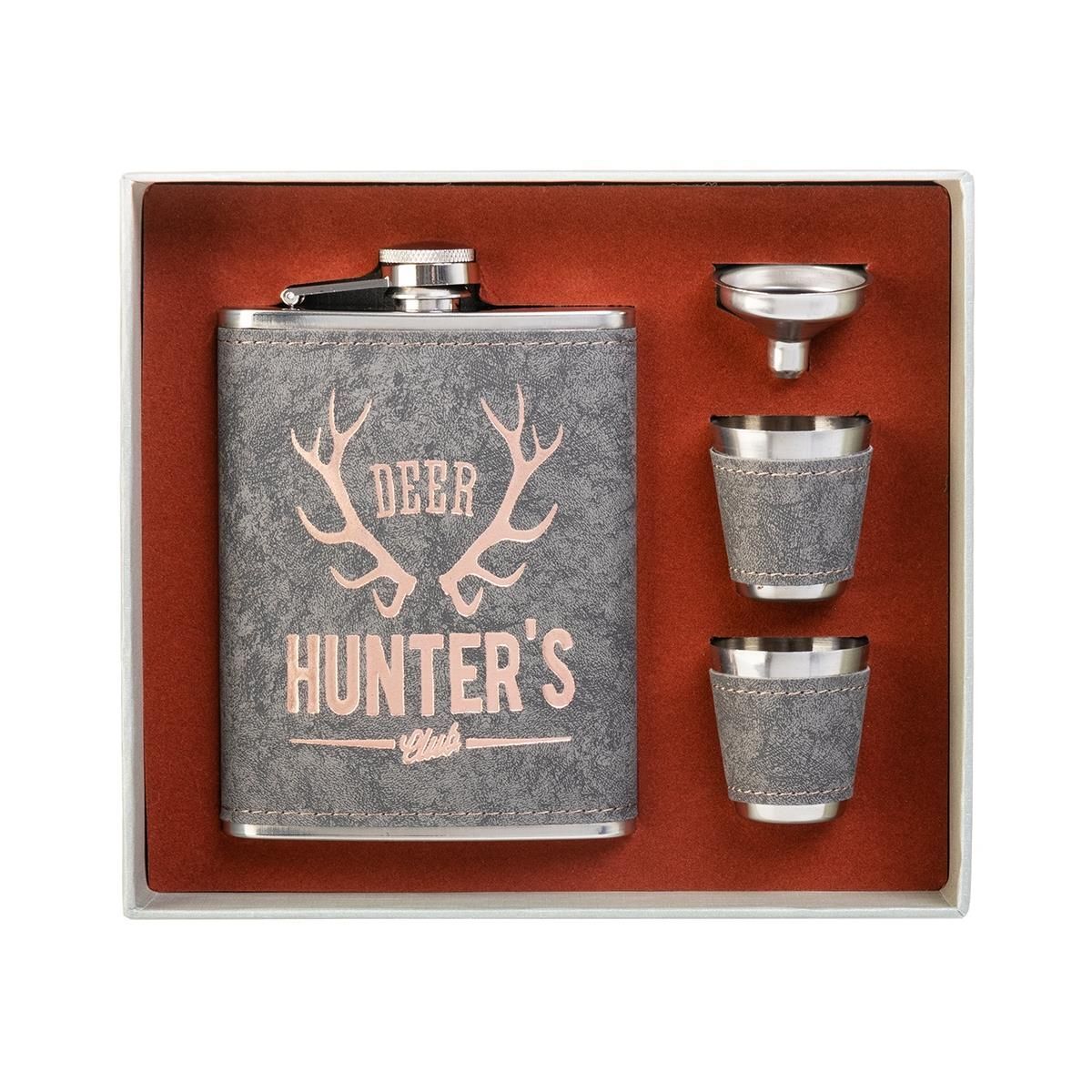 В подарочный набор "Клуб Охотников" входит: фляжка (240 мл) декорированная тисненым рисунком в виде рогов оленя, надписи, 2 стопки и воронка. Фляжка и стопки изготовлены из нержавеющей стали и покрыты искусственной кожей.