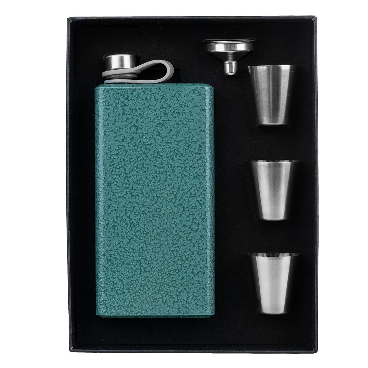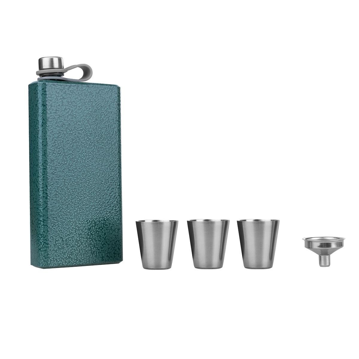 Набор состоит из фляжки объемом 390 мл, трех стопок высотой 4 см и воронки. Все содержимое коробки надежно зафиксировано на мягкой подложке. Фляжка оснащена надежной завинчивающейся крышкой с резьбой, которая крепится к ней гибким пластиковым ремешком.