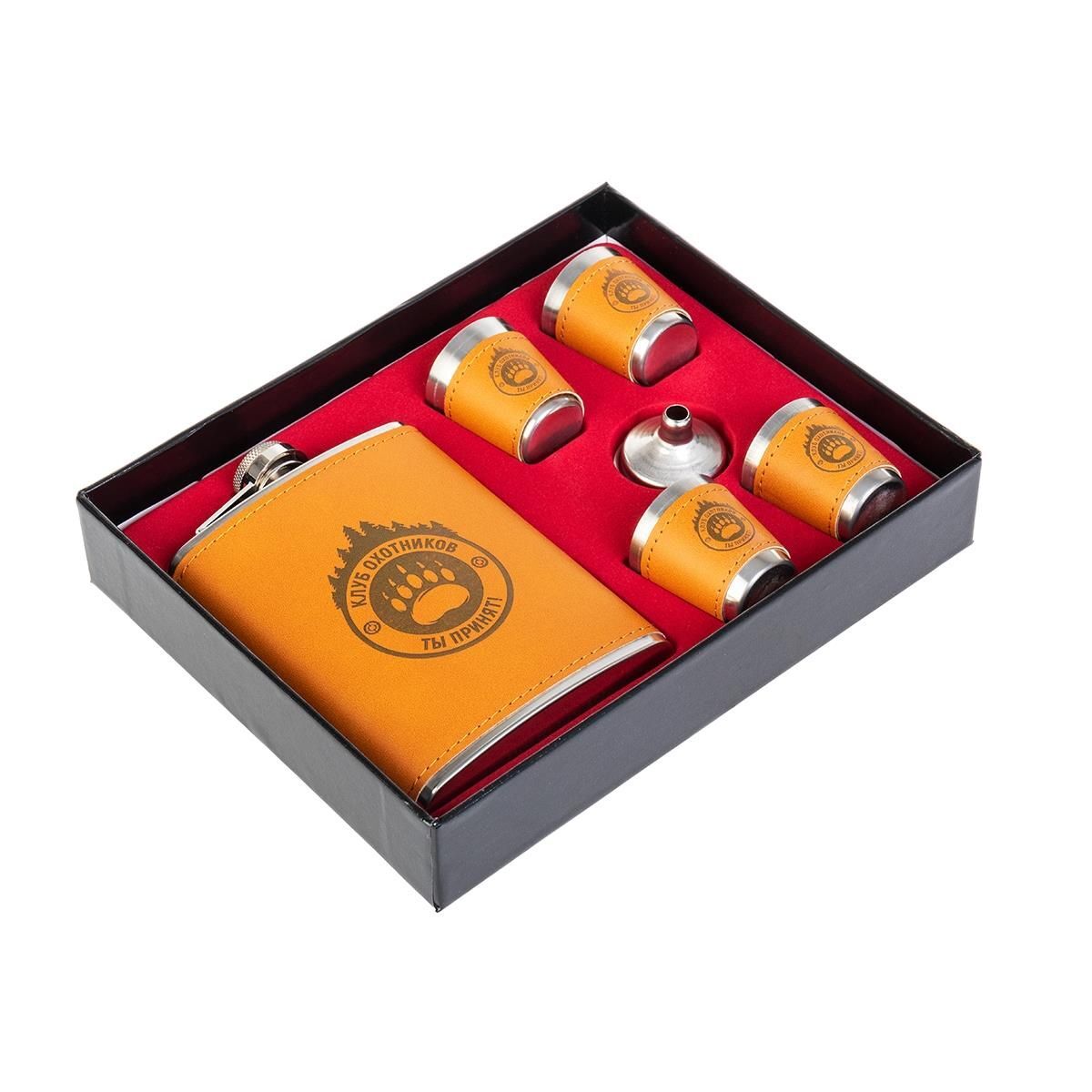 В подарочный набор "Сохраняйте спокойствие" входит: фляжка (270 мл) декорированная c матовым напылением, создающая эффект гравировки, 4 стопки и воронка. Фляжка и стопки изготовлены из нержавеющей стали и покрыты искусственной кожей.