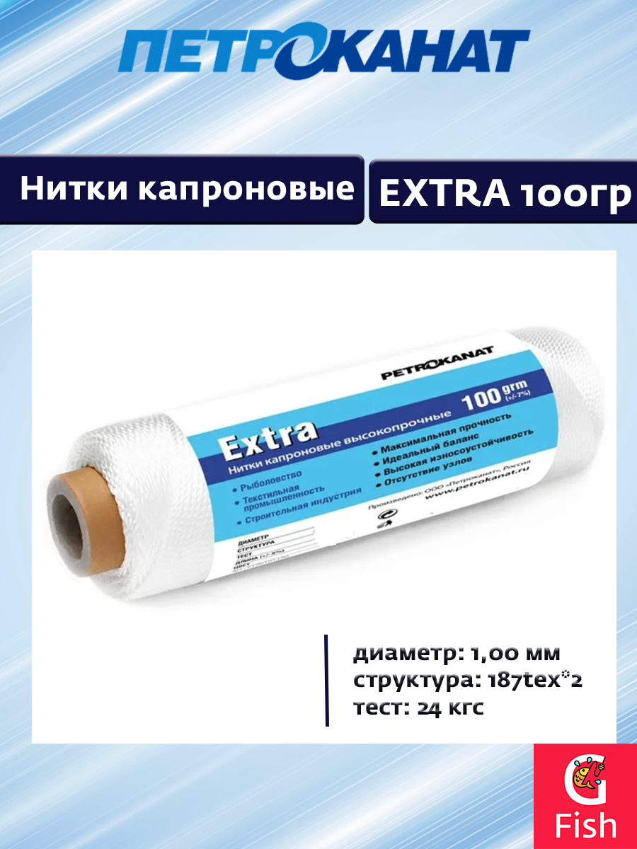 Высокопрочные нитки из полиамида в малых бобинах по 100 г. Производитель – Петроканат, Россия. Выпускаются под брендом EXTRA в соответствии с ТУ 8198-011-67417152-2016.
