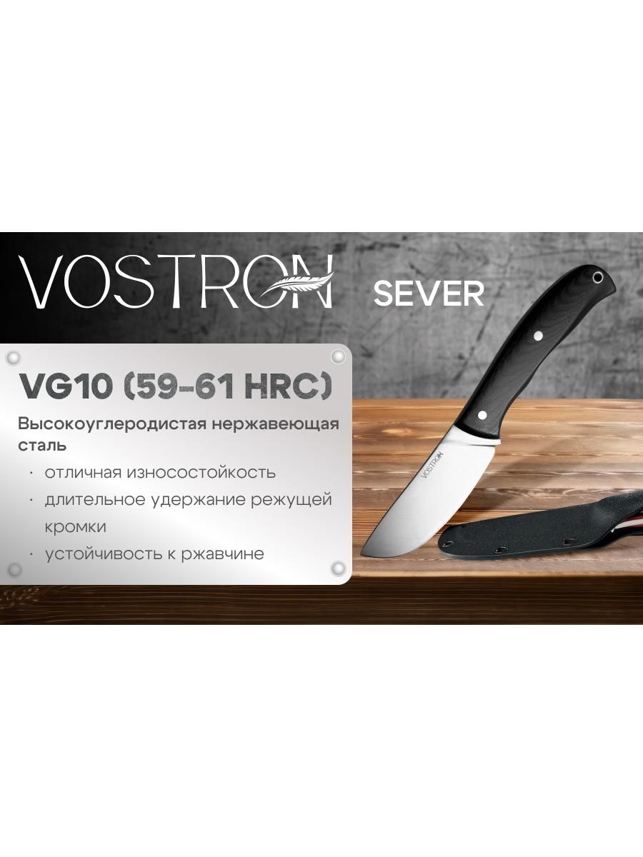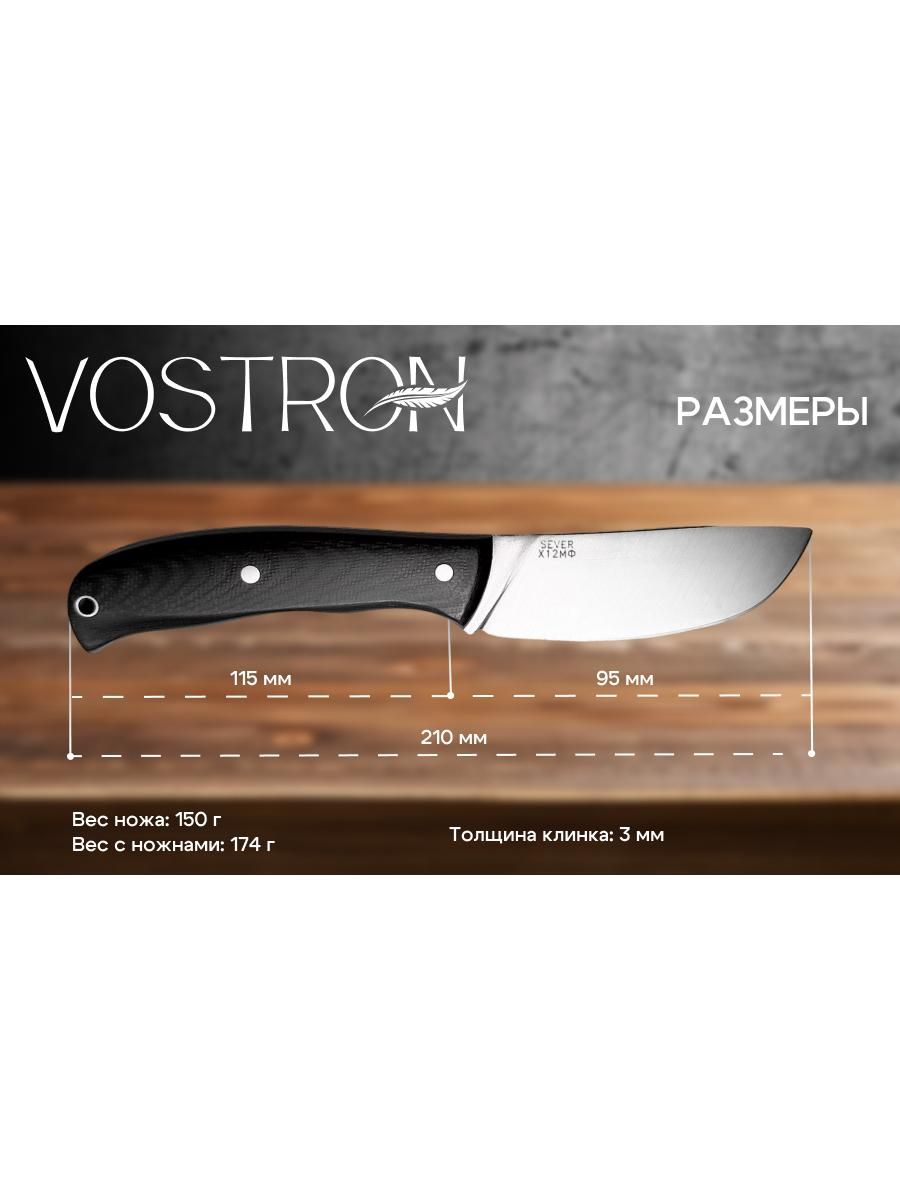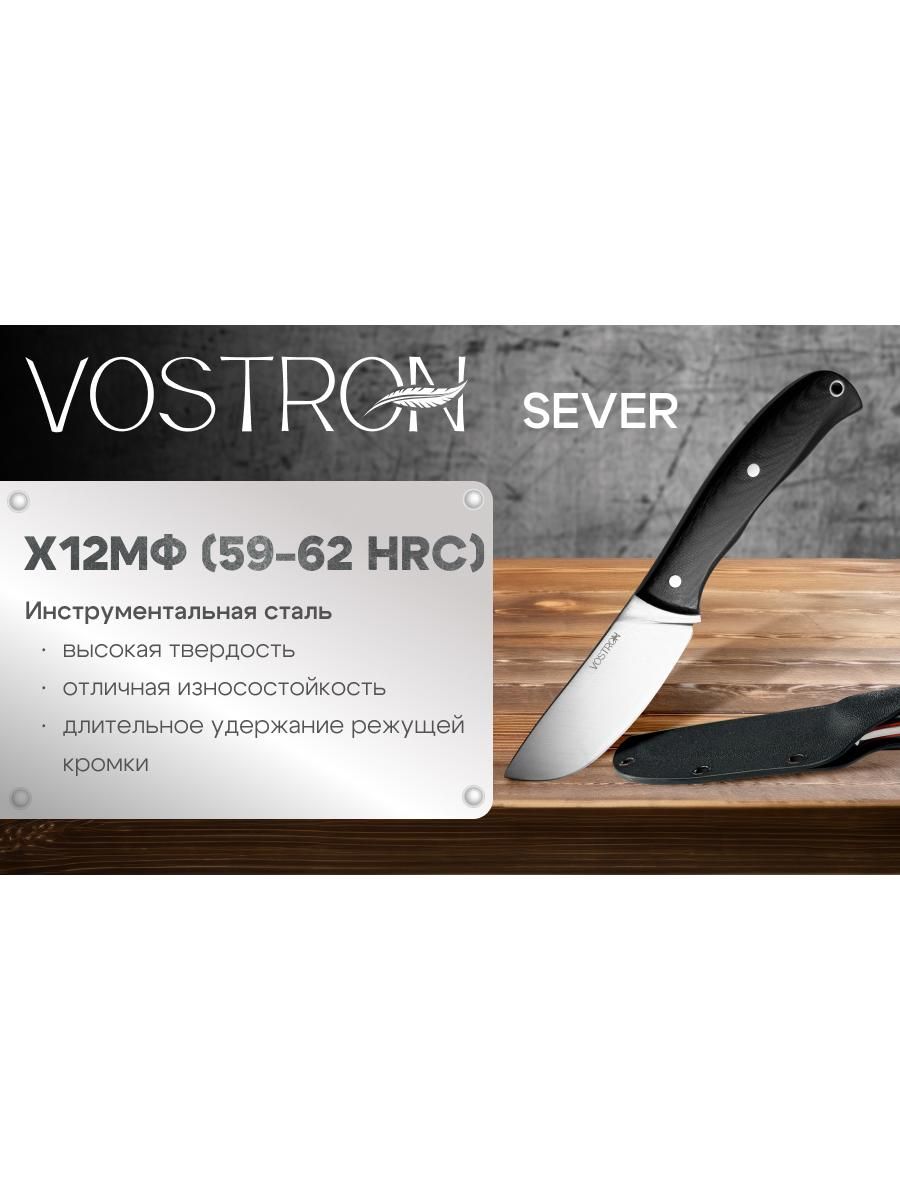 Vostron Sever — фиксированный нож, идеально подходящий для туризма. Клинок ножа выполнен из прочной инструментальной стали Х12МФ, рукоять — из стеклотекстолита G10. Общая длина ножа — 210 мм, вес — 150 г. В комплекте предусмотрены удобные ножны, которые позволяет безопасно хранить и носить нож.