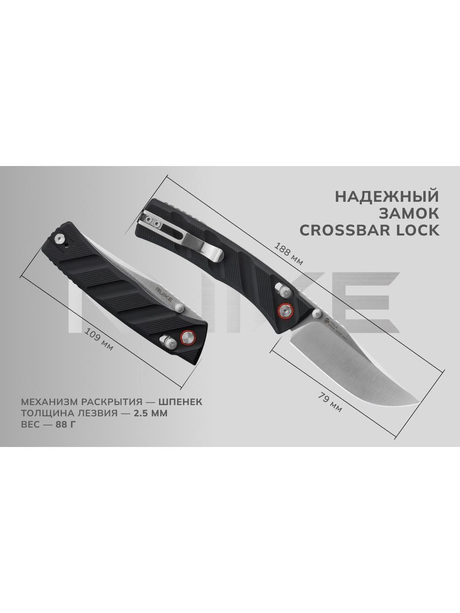 Нож оснащен механизмом Crossbar Lock — одним из самых надежных и удобных замков в складных ножах. Crossbar Lock— модификация замка Axis lock. Принцип работы механизма основан на передвижении подпружиненного штифта, входящего в паз на пяте клинка. Такой замок обеспечивает уверенную фиксацию клинка в открытом положении и легкое, безопасное складывание ножа одной рукой.