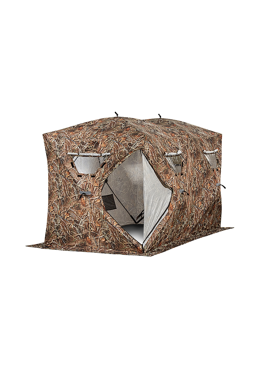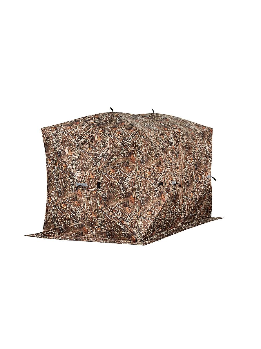 Cдвоенная камуфлированная зимняя палатка традиционной кубовидной формы.