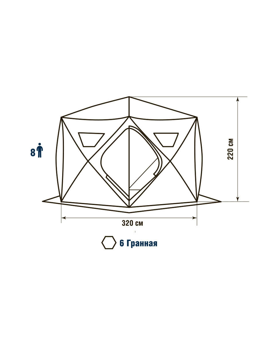 Палатка имеет достаточно внутреннего пространства для размещения компании рыболов или охотников, состоящей из 8 человек. Высота палатки составляет 220 см, что обеспечивает комфортные условия для людей с разным ростом.