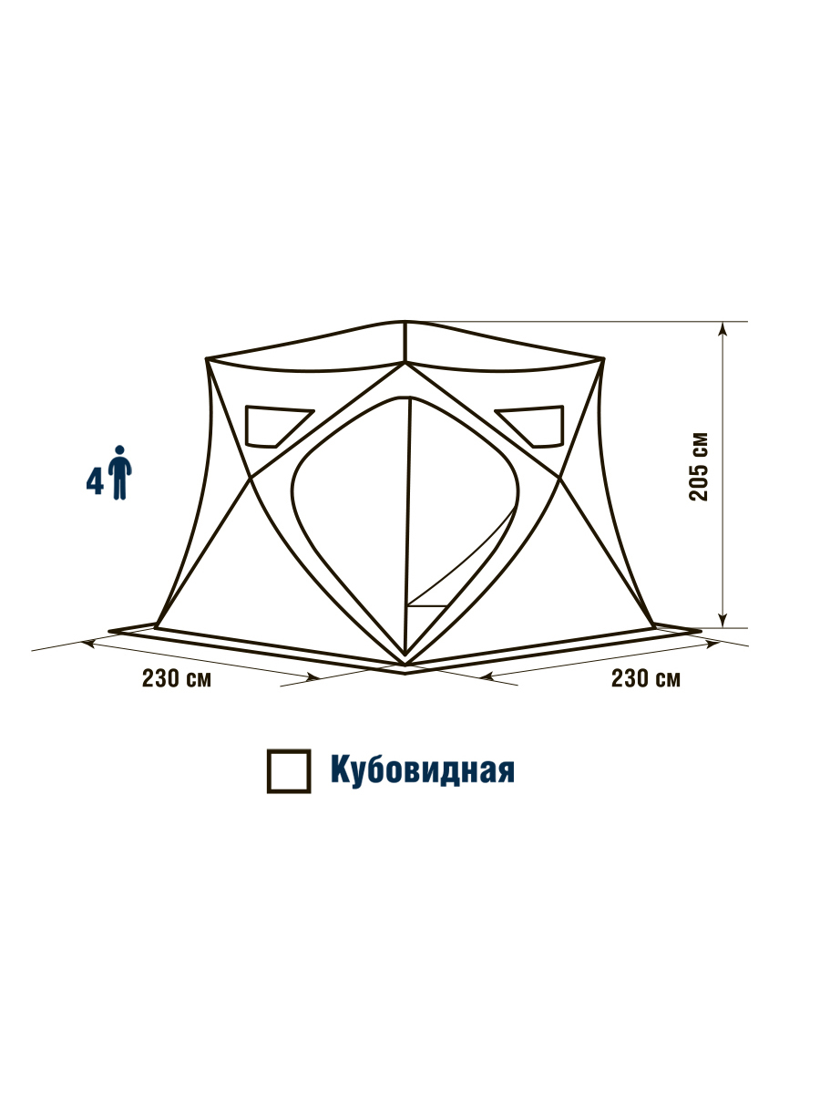 Палатки выполнены из трехслойного материала с термостежкой Nylon 300D-двойной утеплитель-Nylon 300D, с показателем водонепроницаемости 1000мм в. ст.