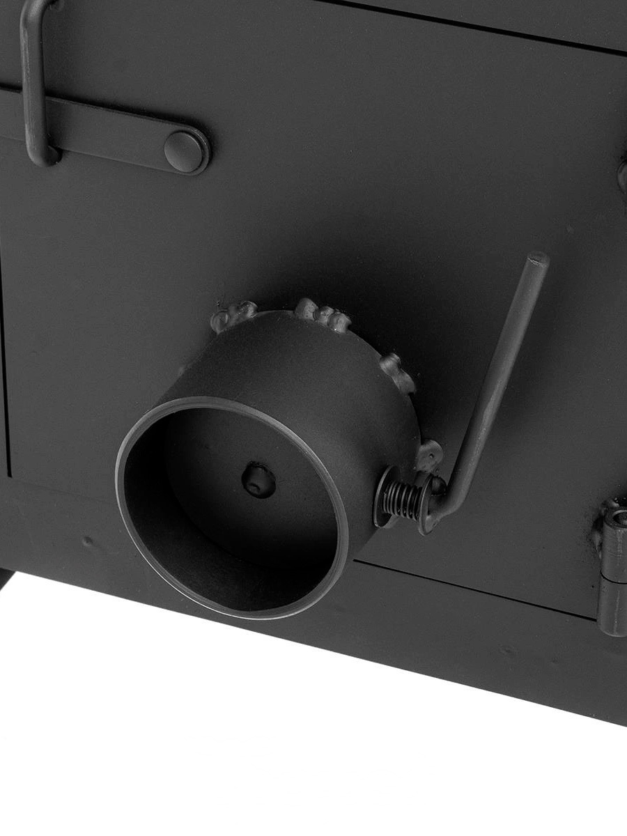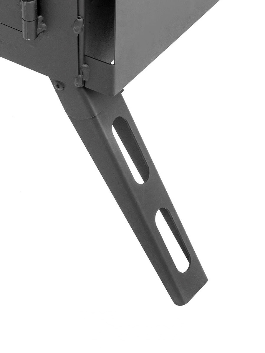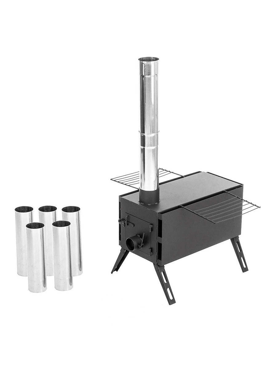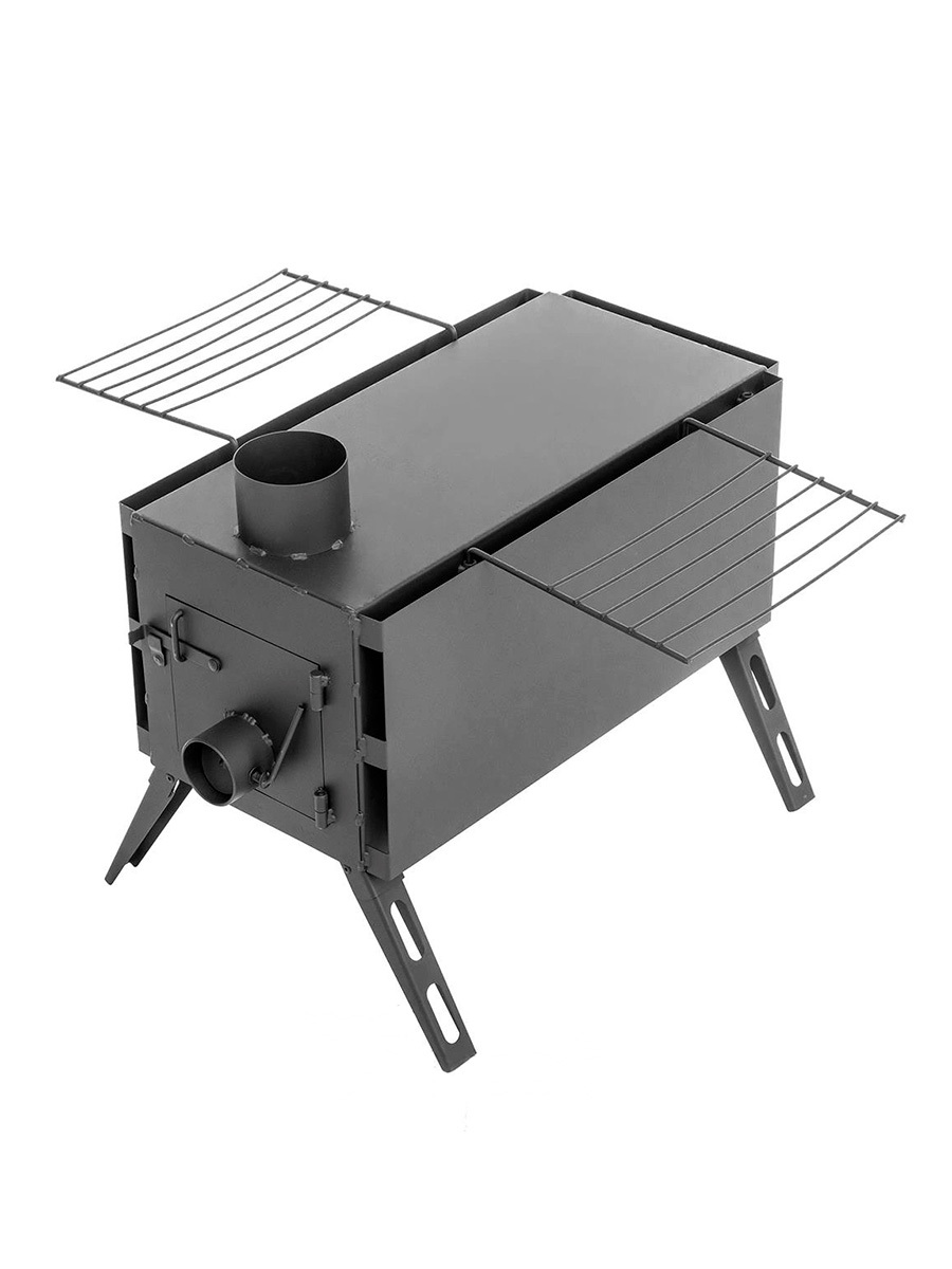 Печь оборудована регулятором подачи воздуха, с помощью которого можно регулировать количество воздуха необходимого для горения. Сборный дымоход состоит из 7 модулей (диаметр трубы 80 мм, длина 1 модуля - 300 мм). Отражающие экраны играют важную роль в безопасности применения печи длительного горения. Печь оборудованная нижним и 3 боковыми отражающими экранами, которые обеспечивают максимальный уровень пожарной безопасности, защищая дно и тент палатки, грунт и личные вещи от оплавления и возгорания. Отражающие экраны также обеспечивают конвекционные потоки вдоль корпуса, способствуя быстрому нагреву воздуха. Складные ножки обладают отличной устойчивостью, быстро устанавливаются, а также значительно уменьшают транспортировочные размеры печки. Верхнюю поверхность печи можно использовать для приготовления или разогрева пищи, разместив на ней металлическую посуду (например, кастрюлю или чайник). В комплекте с печью идет чехол (вещмешок) из износостойкой ткани Оксфорд 600Д для хранения и транспортировки.