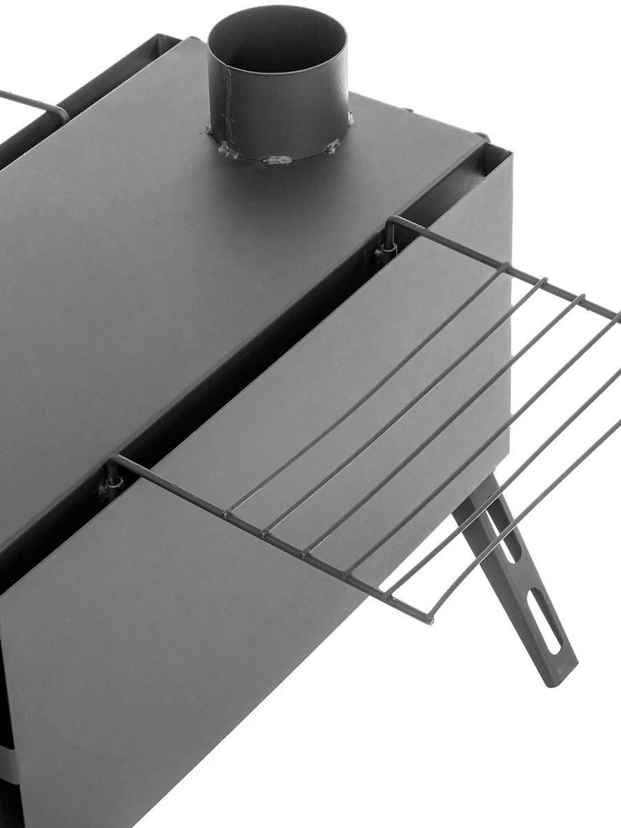 Печь универсальная ПУ-500М Helios - это портативная печь, предназначенная для обогрева передвижных сборно-разборных конструкций, палаток, малогабаритных помещений (гаражей), а также мобильных бань. Может использоваться для подогрева или приготовления пищи. Конструкция печи включает в себя: корпус (топочную камеру) на складных ножках, искрогаситель, дверцу с регулятором подачи кислорода, отражающие защитные экраны с 4 сторон (три боковых и один под дном), 2 решетки для сушки, дымоход. Материал корпуса печи: высококачественная жаропрочная сталь Ст3 толщиной 1 мм (с термостойким покрытием). Швы тщательно проварены для лучшей герметичности и увеличения срока службы. В верхней части топочной камеры расположена специальная пластина - искрогаситель, что увеличивает КПД печки при использовании в палатке в зимнее время года. Искрогаситель образует дополнительную камеру сгорания, которая не позволяет теплу покидать топочную камеру напрямую. В качестве топлива рекомендуем использовать дрова (желательно лиственных пород), брикеты или пеллеты.