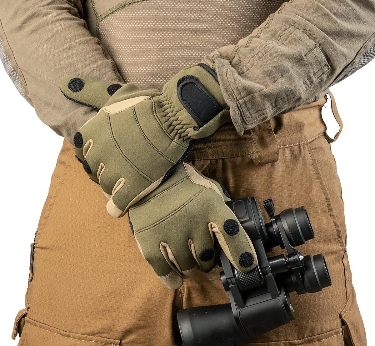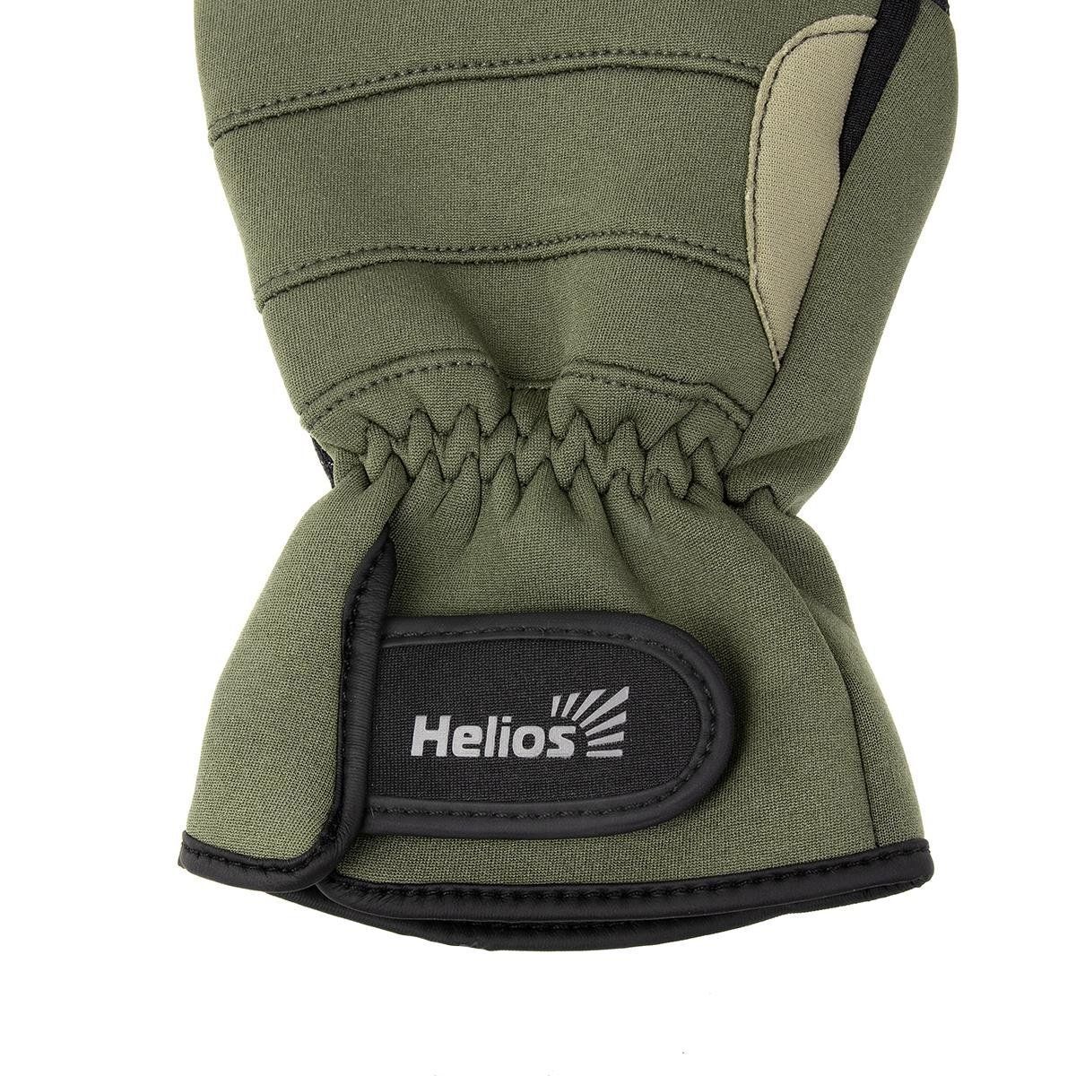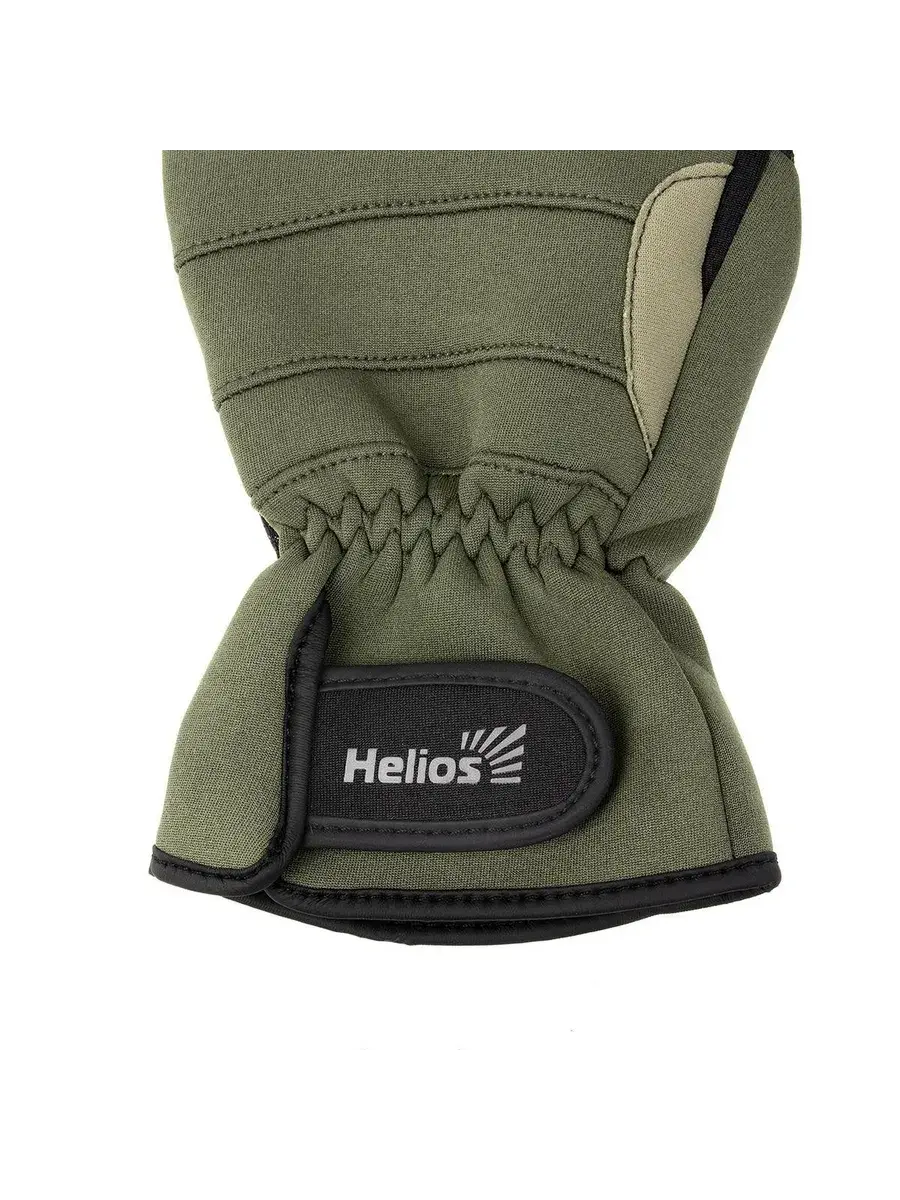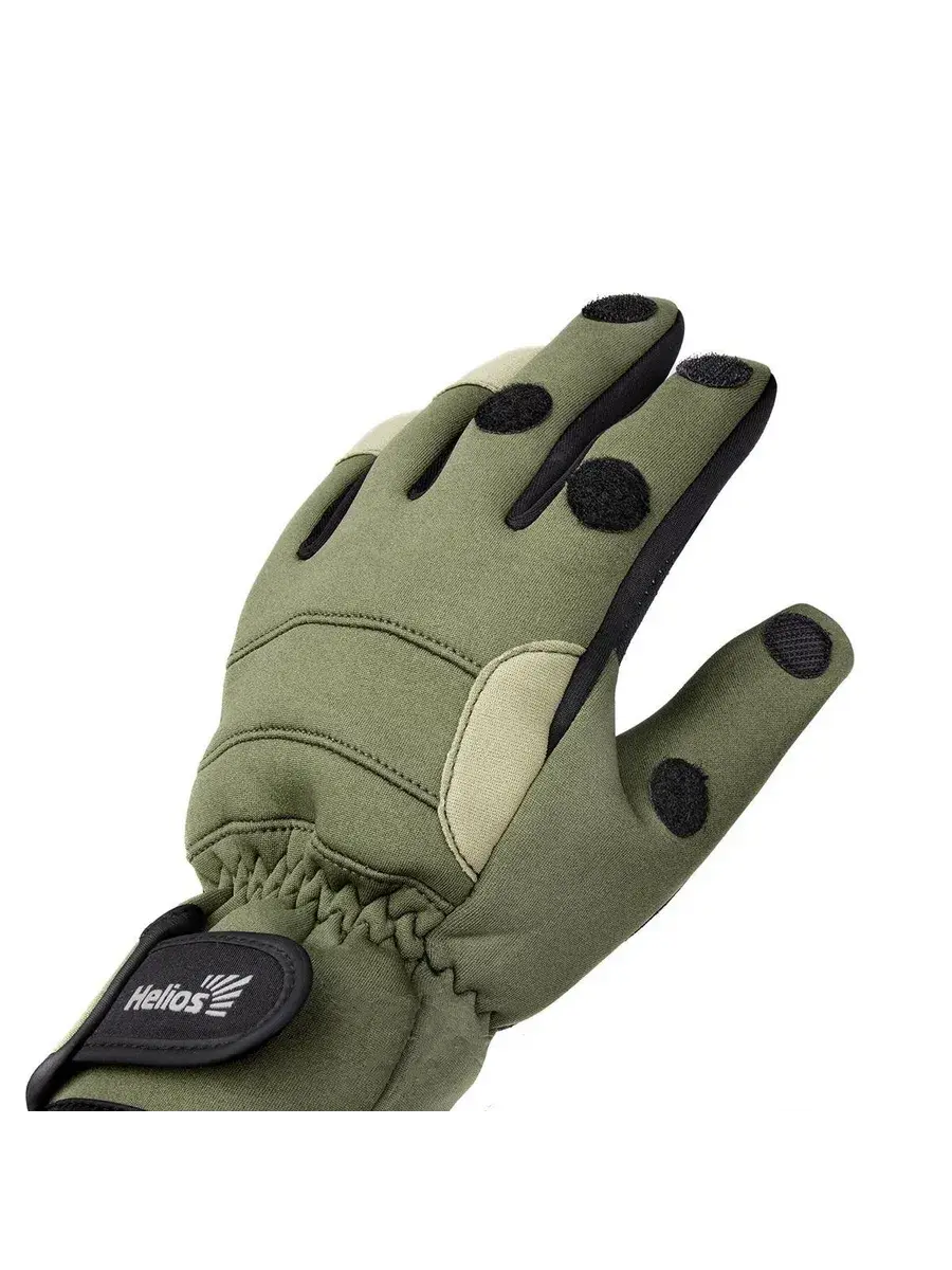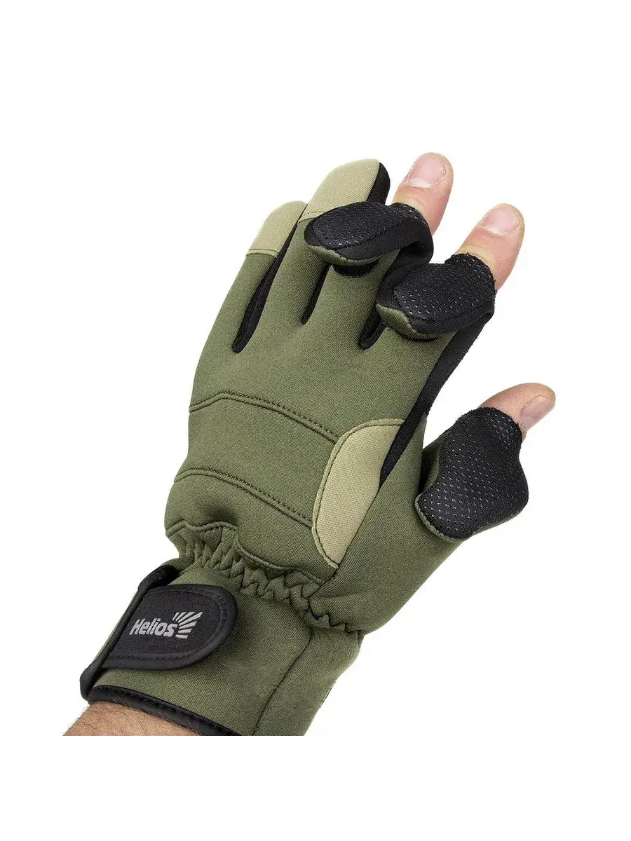 Перчатки рыбацкие неопрен. на липучке Helios (HS-HY-D13) Helios Перчатки из высококачественного неопрена обладают отличными влагозащитными и теплосберегающими свойствами, что позволяет использовать их на рыбалке в осенне-зимний период. Комфортная температура использования: до -5 °C. Анатомический крой обеспечивает максимальное удобство использования. Перчатки имеют нескользящее покрытие на ладонях. На каждой перчатке в паре имеется по три откидных пальца (большой, указательный и средний). Эластичные резинки в области запястий с дополнительной фиксацией на липучку. В качестве ткани, для клиньев между пальцами использован поликоттон (полиэстер 65%, хлопок 35%), который придает дополнительный комфорт и не натирает кожу.