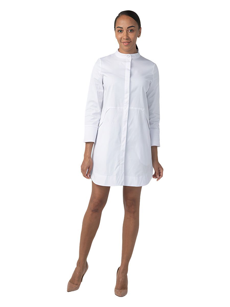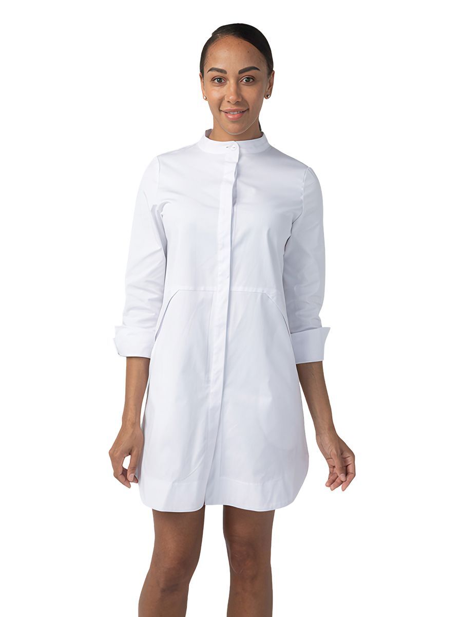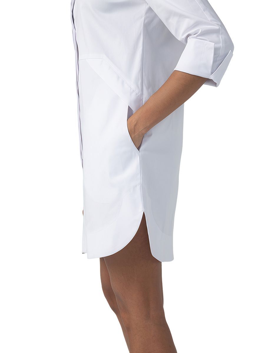 Медицинское платье-рубашка бренда Dr.Nice имеет прямой крой, воротник-стойку и застегивается на кнопки спереди. Модель дополнена двумя боковыми карманами.