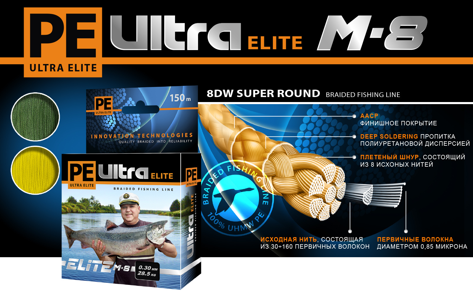 Плетеный шнур для спиннинга PE ULTRA ELITE M-8 Dark Green изготовлен из восьми исходных нитей и производится на современном оборудовании с лазерным контролем качества по технологии 8DW-Super-Round. В сечении шнур получается практически идеально круглым, что сводит размер его «пятна контакта» c кольцами спиннинга к минимуму.
