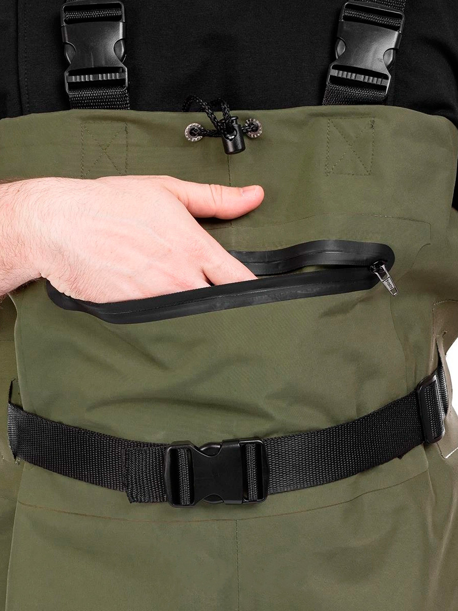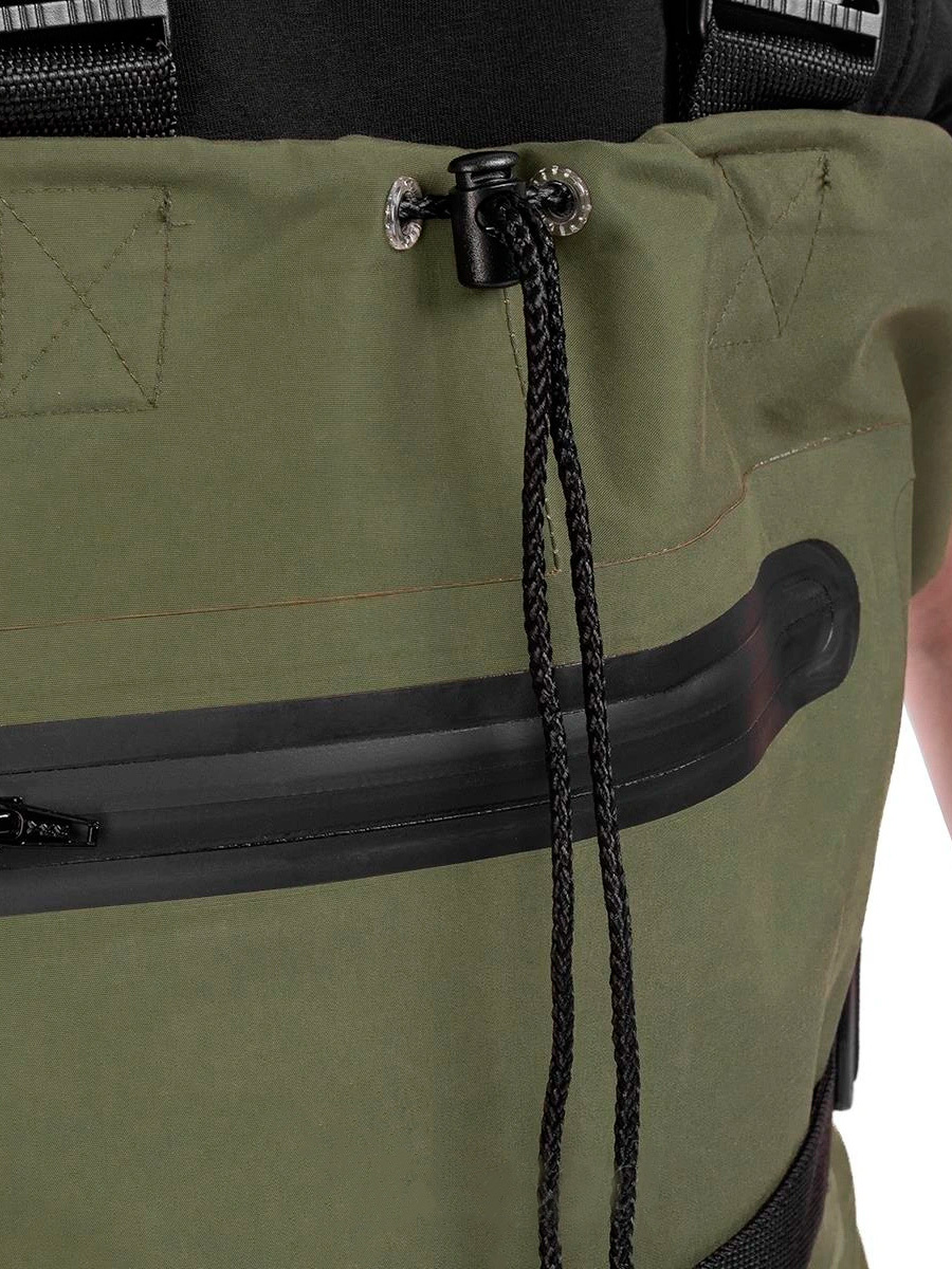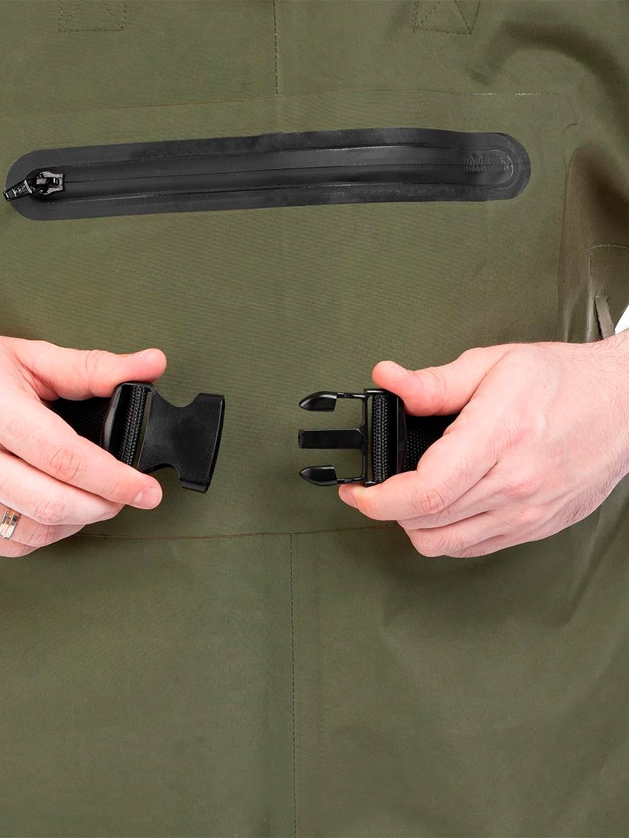 Особенности: 100% не промокаемый, герметичный нагрудный карман, кулиска с фиксатором на талии, шпора для быстрого снимания на пяточной части.
